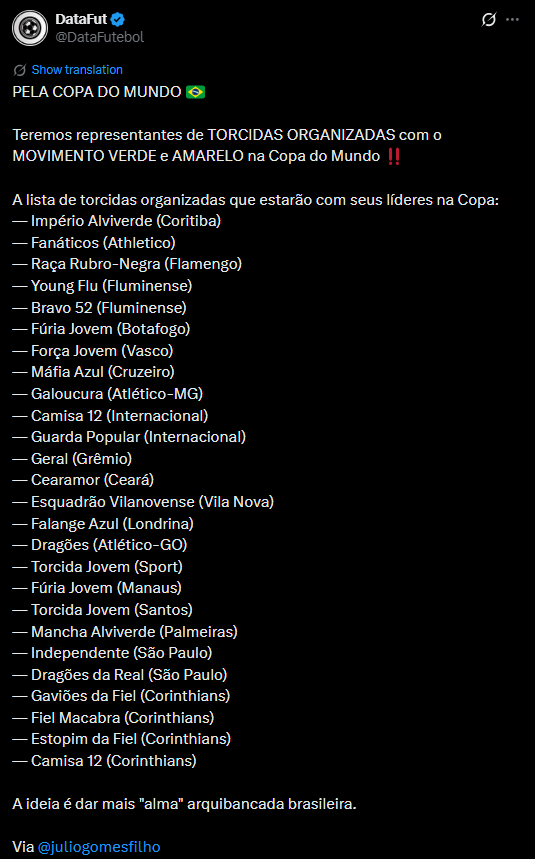 A lista de torcidas confirmadas que estarão com o Movimento Verde Amarelo na Copa do Mundo tem, por enquanto: Império Alviverde (Coritiba), Fanáticos (Athletico-PR), Raça Rubro-Negra (Flamengo), Young Flu e Bravo 52 (Fluminense), Fúria Jovem (Botafogo), Força Jovem (Vasco), Máfia Azul (Cruzeiro), Galoucura (Atlético-MG), Camisa 12 e Guarda Popular (Inter), Geral (Grêmio), Cearamor (Ceará), Esquadrão Vilanovense (Vila Nova-GO), Falange Azul (Londrina), Dragões (Atlético-GO), Torcida Jovem (Sport), Fúria Jovem (Manaus), Torcida Jovem (Santos), Mancha Alviverde (Palmeiras), Independente e Dragões da Real (São Paulo), Gaviões da Fiel, Fiel Macabra, Estopim da Fiel e Camisa 12 (Corinthians).