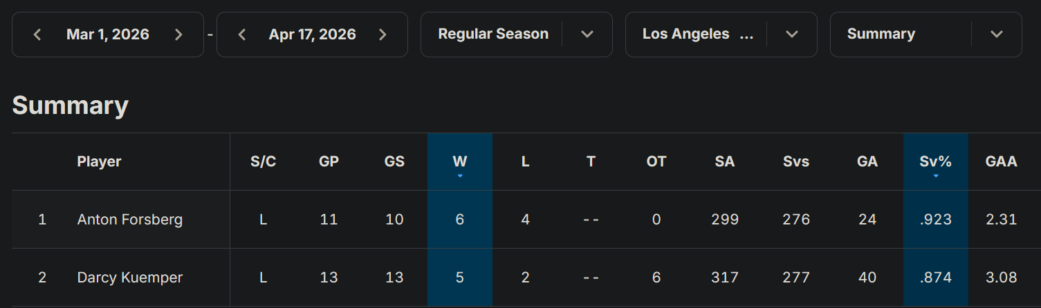 Over his last 7 games (all wins), Wedgewood has a save percentage of 96.4%, pretty good time of the year to have a hot goalie.