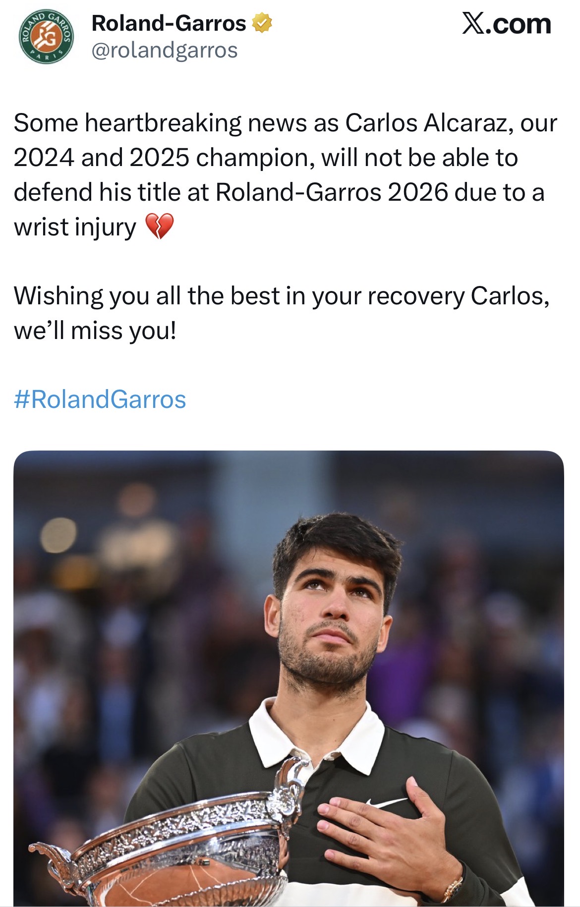 Insider here.Alcaraz has a career ending injury. He'll announce his retirement by the end of the year.