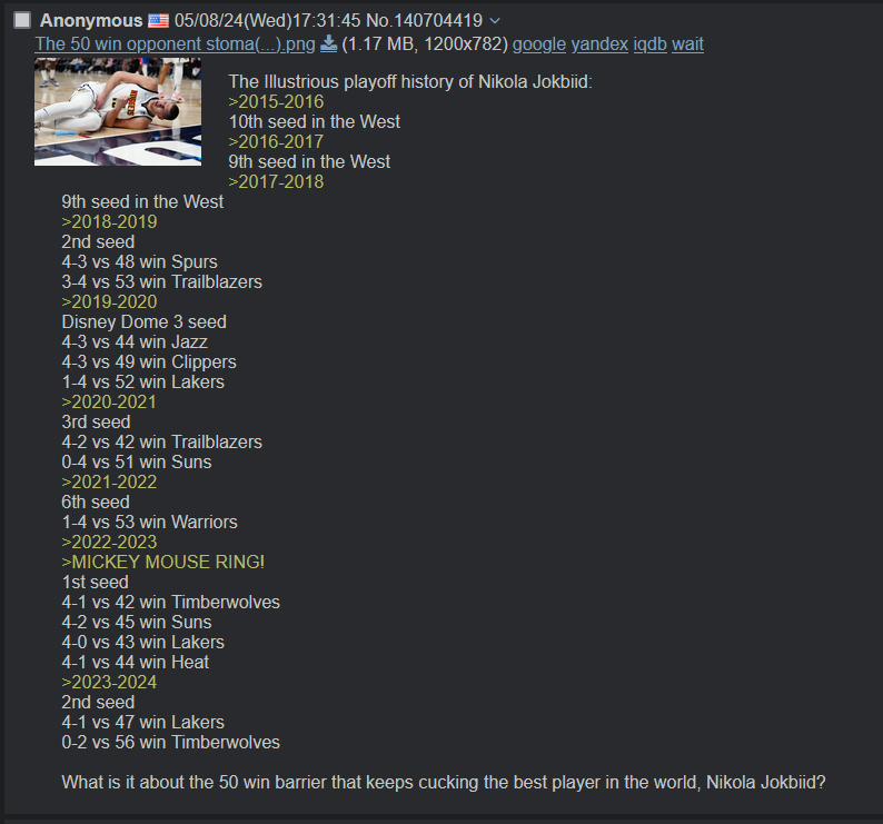 I legit dont know if i could cope with another early exit for the nuggets. Jokic was supposed to be the GOAT by now. He was so close to winning eurobasket with serbia. FIBA. Olympic gold. 5 mvps. If he won the game 7s in 2024 and 2025 the nuggets would probably win every other series. Some of it is bad luck, other stuff is choking.Its easy to talk about these hypotheticals but most of these losses were so close