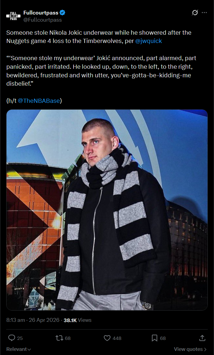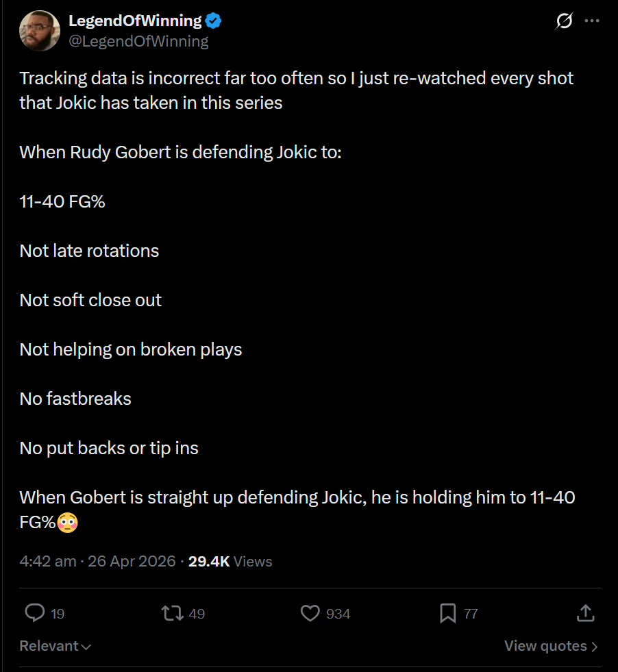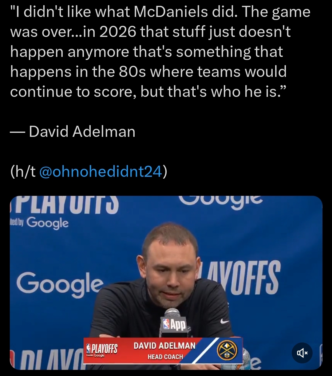 Mike Conley on if he was trying to start trouble at the end of the game passing it up to Jaden McDaniels“(Laughs) nah that was a slip up, that’s all on me I take the blame… as soon as I threw it I looked and I was like “ah it’s Jaden” I almost put my hands on my head and I was like “maybe he won’t” and then as soon as I saw him when the ball kind of bounced a couple times “it’s over man” you can even see me like lower my head”https://x.com/adukeMN/status/2048259447147905503REAL FUCKING DEMON