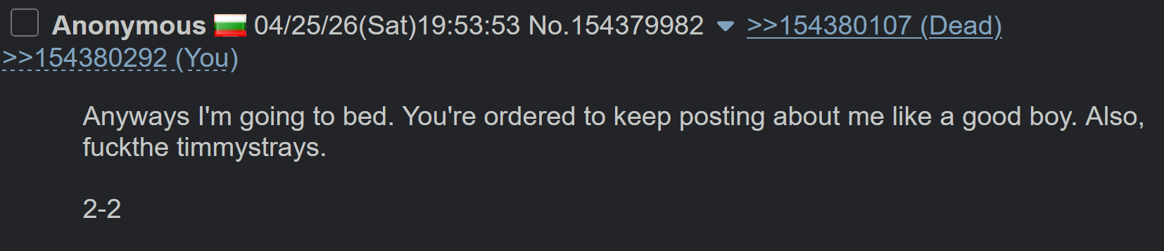 >>1543856544chan makes it easy to know whose comment to skip with a read leaf on their flag