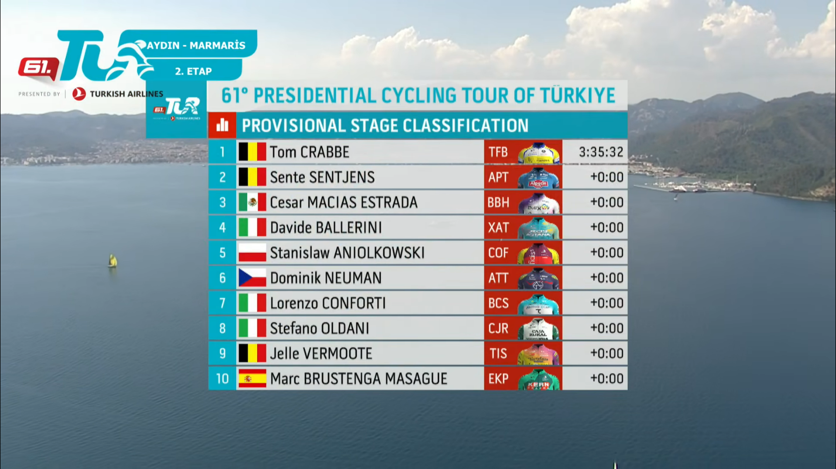 Presidential Cycling Tour of Turkiye (2.Pro)Stage 2Aydın - Marmaris152.8kmStartlist:https://www.procyclingstats.com/race/tour-of-turkey/2026/startlistGC after stage 1:https://www.procyclingstats.com/race/tour-of-turkey/2026/stage-1-gcRoadbook:https://www.tourofturkiye.org.tr/Content/files/race_guide/TUR2026_RACE_GUIDE_2204.pdfLive stats:https://www.procyclingstats.com/race/tour-of-turkey/2026/stage-2/liveStreams:https://www.youtube.com/@tourofturkiye/streamshttps://cyclingtiz.live/https://dlhd.dad/Eurosport / Discovery+ / HBO / TNT13:30 CET