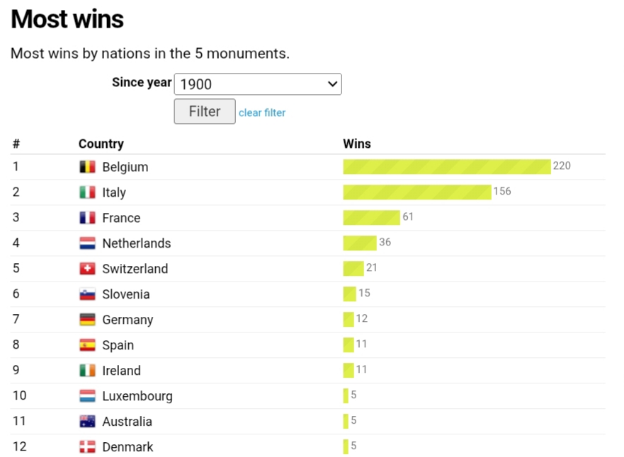 Top 10 countries with the most wins in GTs + monuments + WC RR1. Belgium: 2832. Italy: 2613. France: 1234. Spain: 655. Netherlands: 496. Switzerland: 347. Slovenia: 278. Germany: 199. United Kingdom: 1810. Ireland: 15Slovenia is bigger cycling country than Britain or Germany already. Switzerland soon