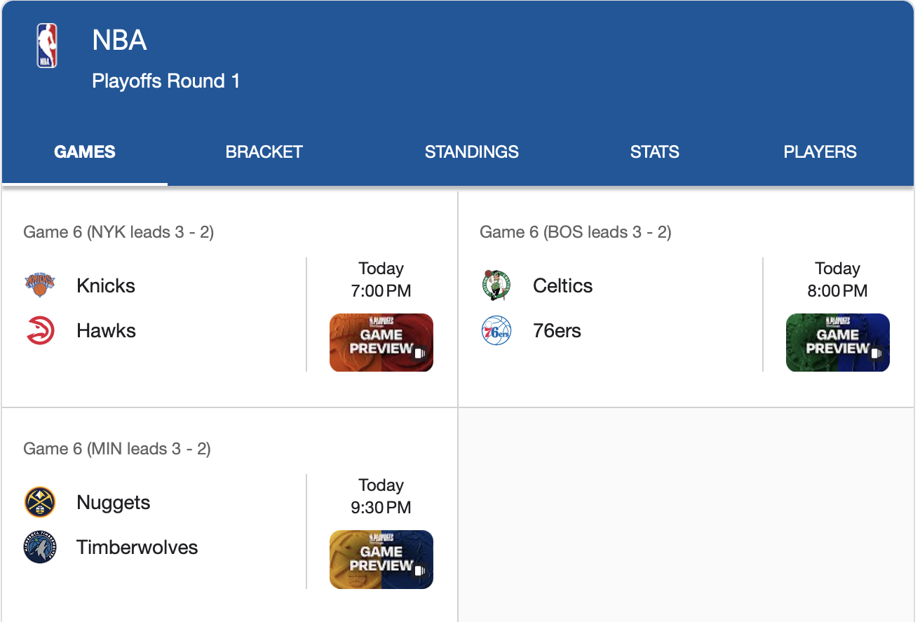 We swept the board last night, 3-0. We are 14-8 over the last 7 days. Looking to keep that momentum rolling. Let's smash those bookies.>Knicks-Hawks under 213.5Gonna use some zig-zag theory here. Game 2 & 4 went under. Games 3 & 5 went over. We're due for an under here. Also, as home team, 58% of Hawks games went under. As road team, 58% of Knicks games went under. I think this is going to be a dogfight as Hawks try to avoid elimination.>Joel Embiid double-double (+145)We were two assists away from hitting this last game. I just think the Celtics don't have an answer for Embiid and they might actually be in trouble this series if they can't figure it out. Embiid averages 25 points and 11 assists in the playoffs throughout his career. I can't pass up this great value at plus odds.>Nuggets -6.5No Ant, no bueno. The Wolves have been one of the worst home teams in the league over the last 3 years. Since 2023, the Wolves are 64-73-3 ATS at home. The Nuggets are 24-19 ATS on the road this year. Without Ant and Divincenzo, I just don't see how the Wolves are going to keep up the scoring. And Gobert completely disappears when Ant isn't on the court. I like Nuggets to even this series up tonight.Good luck, and don't bet what you don't have.