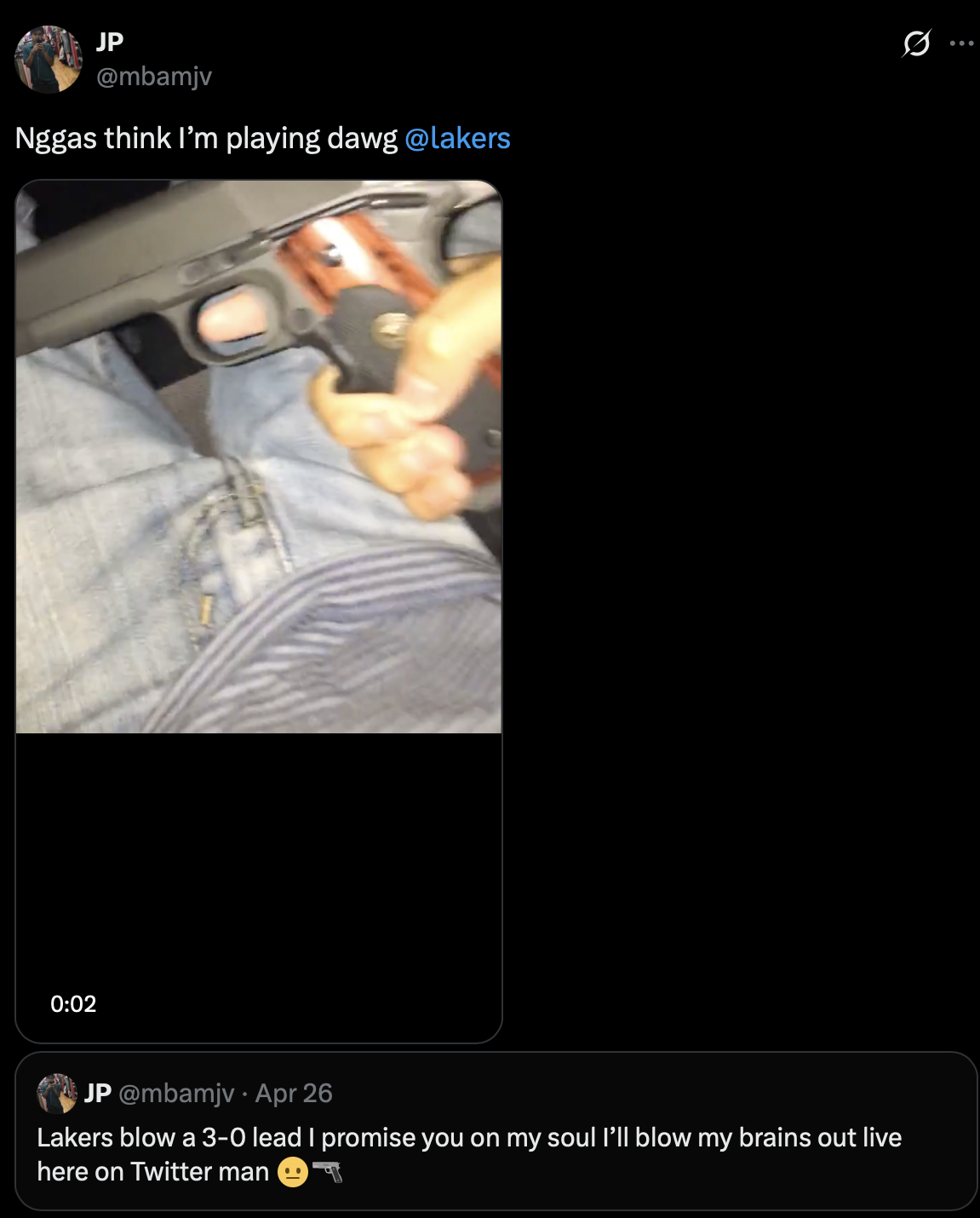 >>154442379a lakers fan says he will kill himself on twitter live if they blow the 3-0 lead...