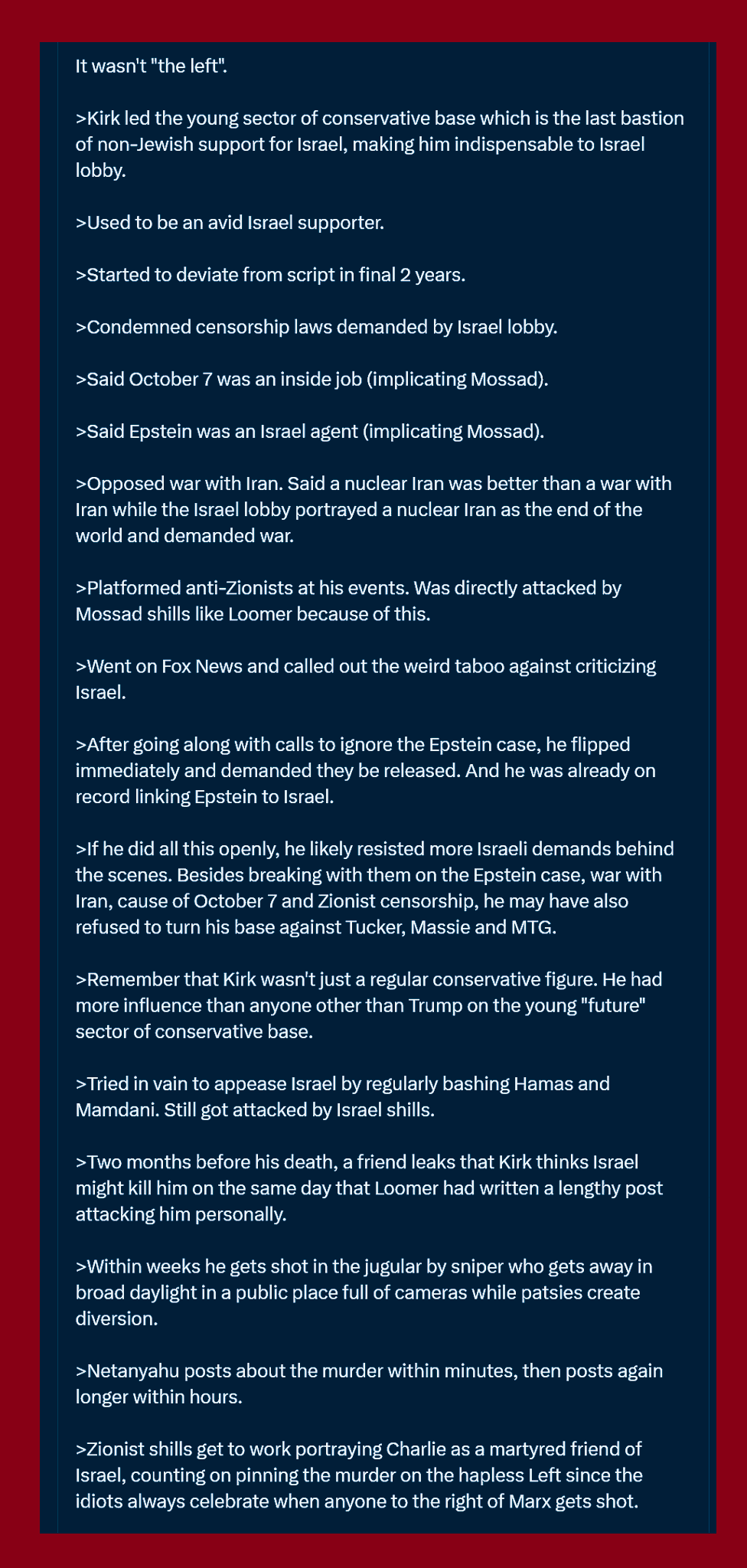 DO NOT LET PEOPLE TELL YOU THE EXIT WOUND WAS WHERE KIRK WAS SHOT. HE WAS SHOT FROM THE BACK RIGHT AND THE BULLET CAME OUT HIS LEFT FRONT SIDE OF HIS NECK.Possibly original recording from the front:magnet:?xt=urn:btih:bf02d3428c2bd306eaf465587a5f5cd8929377bb&dn=shooting-of-charlie-kirk&xl=2245420&tr=udp%3A%2F%2Ftracker.openbittorrent.com%3A80&tr=udp%3A%2F%2Ftracker.opentrackr.org%3A1337%2FannounceLarger torrents will be made as uncompressed video evidence is collected and saved.