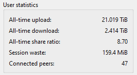 I don't seed 24/7 and disk that had my transmission config died few months ago, but that didn't stop me$ te -stCURRENT SESSION Uploaded: 23.43 GB Downloaded: 67.11 MB Ratio: 349 Duration: 5 hours (20491 seconds)TOTAL Started 163 times Uploaded: 1.13 TB Downloaded: 534.3 GB Ratio: 2.10 Duration: 37 days (3220666 seconds)
