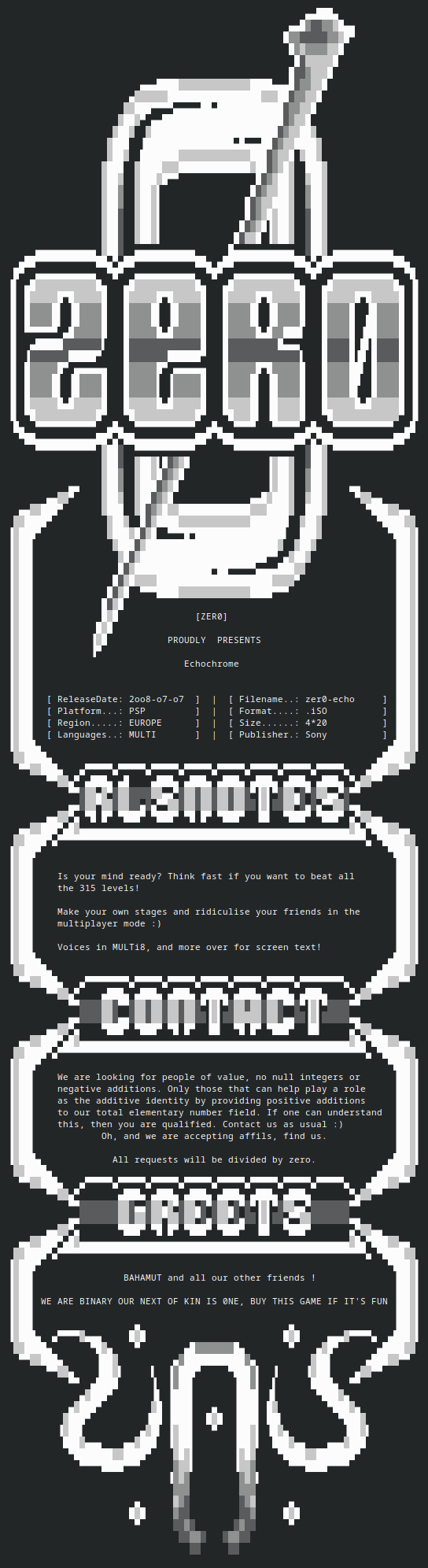 Echochrome is a fun PSP video game. It's a puzzle game, and I remember playing it quite a few years ago.>>1368410Torrent infohashes for that (minified JSON):https://apibay.org/q.php?q=Leisure+Suit+LarryPrettified JSON:https://archive.vn/Mndqv>>1368427>torrent stuck at 99.9% due to missing filesSo the last part of the ISO is not transferable over BitTorrent due to how that system works (missing files and chunks and so on). To fix for that problem, here's the last 4 MB of that .iso:>https://ipfs.desmos.network/ipfs/QmeJzstbtZZgpEpzPMg4zedaACKWPPRzN5K6MQ1LGjWC2hOr, full .iso in:>https://ipfs.ssi.eecc.de/ipns/k51qzi5uqu5diwzufekv38cynmdqlh0lwic1ve0d9w5a0glpy52qjc0l77h4t5/a/root/web/raws/ia/download/FjHHRRMPFjYxRpgi