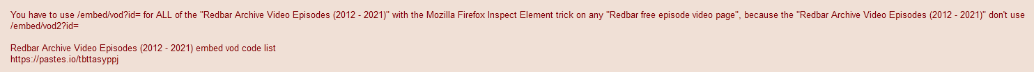 >>1379154>>1379170>>1380477>>1391603When you say "First seasons ep links missing from the list", i am going to assume that you're asking me why i didn't post ALL of the "embed vod2 codes" for Redbar Season 20 / 21 / 22 ?I didn't post ALL of the "embed vod2 codes" for Redbar Season 20 / 21 / 22, because it's unnecessary and anyone can literally guess the missing "embed vod2 codes" for ALL of the Redbar Season 20 / 21 / 22 Episodes, plus i didn't want to clutter my message "1380477" with "embed vod2 codes" that anyone can literally guess themselves.For example: if i wanted to watch any of the Redbar Season 20 / 21 / 22 Episodes, i would just use /embed/vod2?id=REDBAR-S20-E01 or /embed/vod2?id=REDBAR-S21-E01 or /embed/vod2?id=REDBAR-S22-E00 and you just change the episode number to whatever desired episode number for Redbar Season 20 / 21 / 22.The only Redbar Season 20 / 21 / 22 Episode "embed vod2 codes" that you wouldn't be able to guess are the "embed vod2 codes" that i have already posted in my previous message "1380477", hence why i posted them in the first place.if that's not what you're asking me, then i am going to assume that you're asking me why is there missing "embed vod codes / video episodes" for the early years Redbar Episodes (2006 - 2013) ?, it's because there isn't any "embed vod codes / video episodes" for the early years Redbar Episodes (2006 - 2013), and there is ONLY boring audio / mp3 links for the Redbar Episodes (2006 - 2013), and i couldn't care less about boring Redbar audio ONLY episodes, because i only care about Redbar video ONLY episodes.Reminder for everyone / newbies: you have to use /embed/vod?id= for ALL of the "Redbar Archive Video Episodes (2012 - 2021)" with the Mozilla Firefox Inspect Element trick on any "Redbar free episode video page", because the "Redbar Archive Video Episodes (2012 - 2021)" don't use /embed/vod2?id=Redbar Archive Video Episodes (2012 - 2021) embed vod code listhttps://pastes.io/tbttasyppj