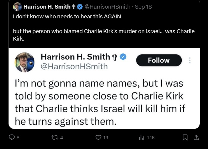 >>1380267>>1380248leftists hate israel and always have. but for sensible reasons and not because they are jewish. they are not going to be assassinating people for the mossad or the qanon podcaster-ran fbi. you are using a lot of words when you could just say "jews" and be more coherent. incorrect, sure, but more coherent.saying kirk disliked israel is reivisionist history. it's easy to find him joking about gaza being flattened. but he had to be tactful because he ran the hitler youth and knows gen-z was a bit more divided on 60,000 dead children. acting like he said globalise the intifada so israel assassinated him (through their contacts in the transgender community or whatever) is very stupid.the pattern in shootings is straight cis white men who are radicalised online.not checking this thread again in case whatever you have is contagious.