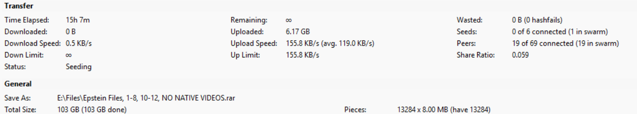 Final torrents, all files I removed from 10-11, as well as the link for what I have of 9magnet:?xt=urn:btih:D99C50A18B7BE1D9E8856472D3A8FA7F76F7E62D&dn=Epstein%20Files%2c%201-8%2c%2010-12%2c%20NO%20NATIVE%20VIDEOS.rar&tr=udp%3a%2f%2ftracker.openbittorrent.com%3a80%2fannounce&tr=udp%3a%2f%2ftracker.opentrackr.org%3a1337%2fannouncemagnet:?xt=urn:btih:BC1C90176A647E04725FF2C530EC8E35C8965A02&dn=dataset9-more-complete.tar.zst&tr=udp%3a%2f%2ftracker.openbittorrent.com%3a80%2fannounce&tr=udp%3a%2f%2ftracker.opentrackr.org%3a1337%2fannounce