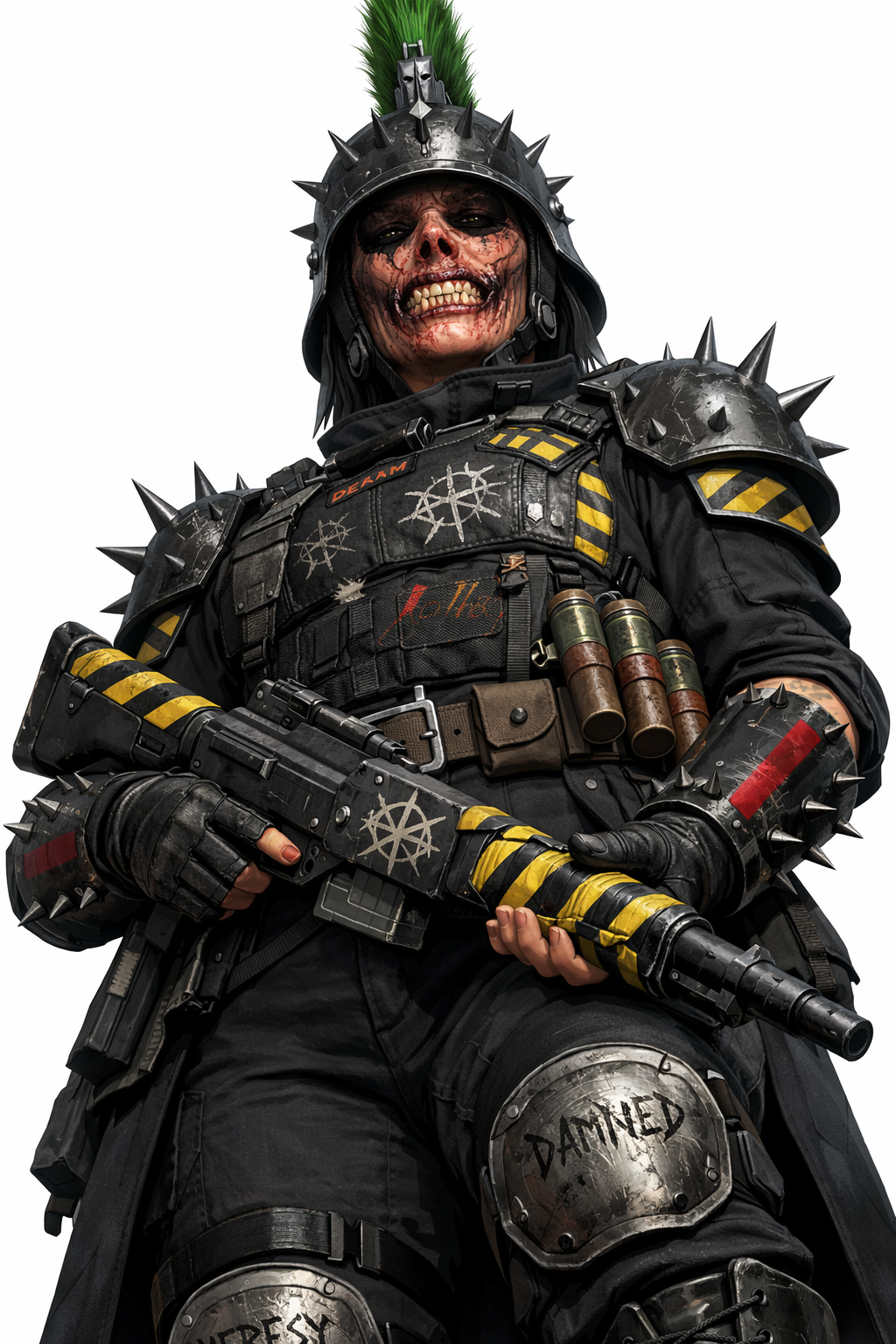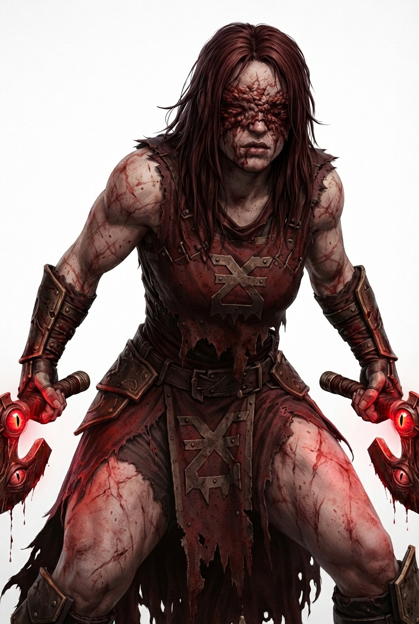 >>97363374>"She is blind beneath the scar tissue, sightless meat pulled tight where eyes once were. When unarmed, she is inert; listening, breathing, waiting. But when those axes are in her hands, the world ignites. The red eyes set into their rusted heads open, and she sees through them: motion, heat, fear. At first. Every swing sharpens her vision. Every kill brings the picture into focus. Every drop of blood makes her senses sharper. Disarm her and she is helpless."— Brother-Archivist Malrec Voss, Raven Guard Space Marine