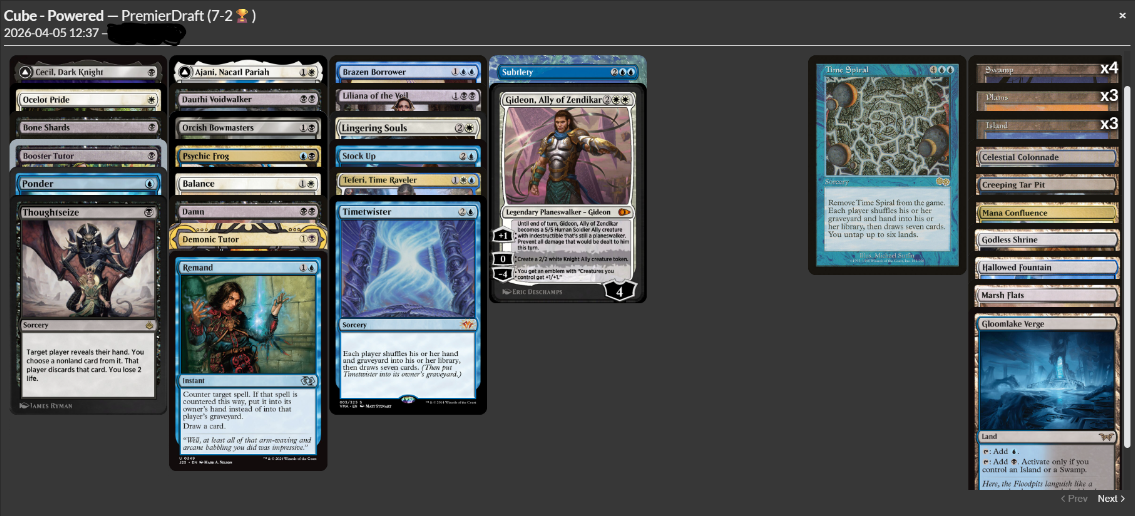 Really did not think this deck had it in it to trophy but trophy it did. God I really like playing cube. Obvious good cards are frog and bowmasters (with time spiral and twister) You can dump your hand on frog or just deal 7 with bowmasters making an 8/8 is pretty good. LSV sez he doesn't like dauthi voidwalker but its awesome when you can steal the opponents best card with thoughtseize. Im really bullish on subtlety desu. Seeing a lot more fair decks but my rank is withered and im in plat whatever so i dont know.