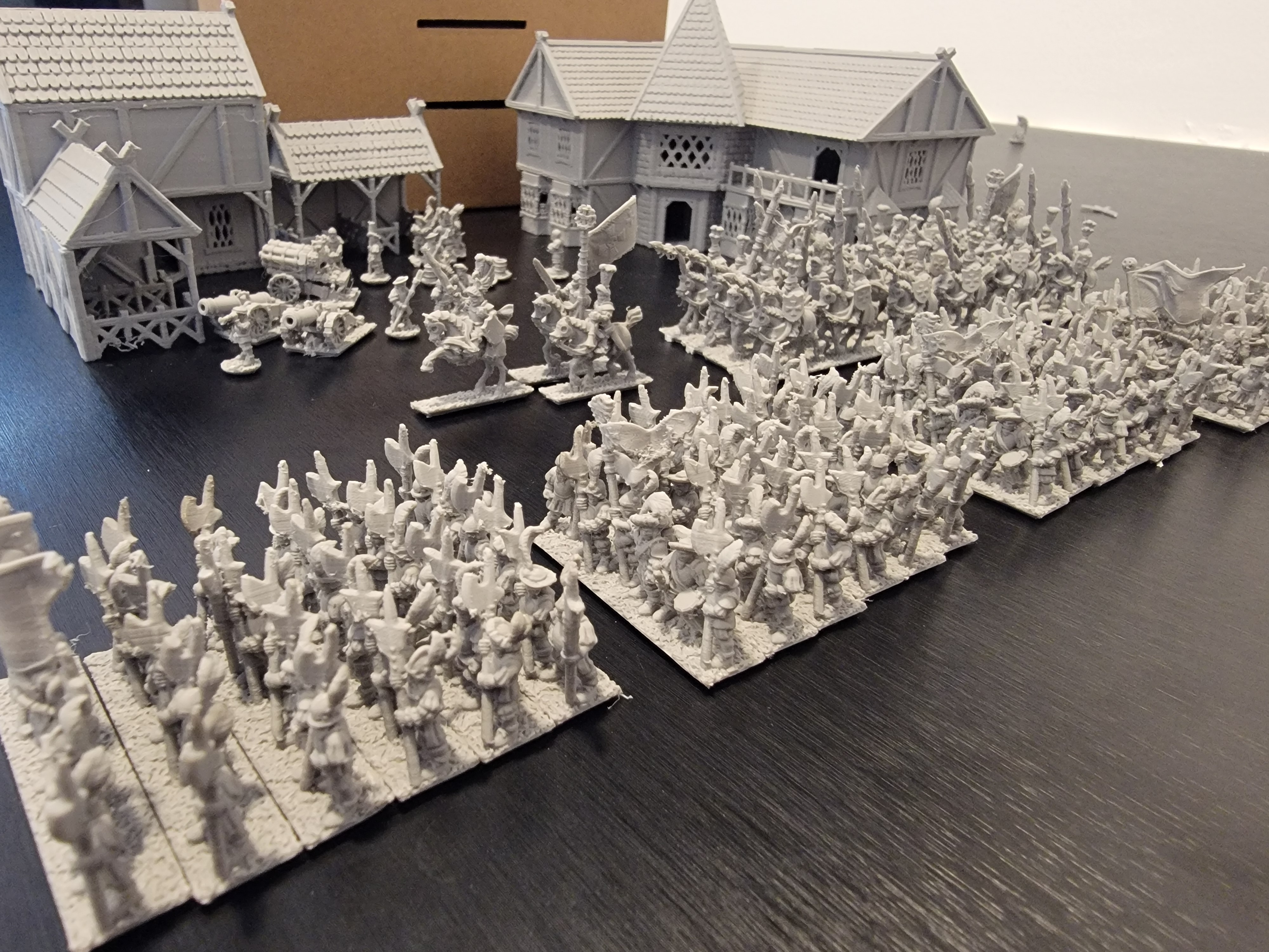 >>97840751Thanks for the dopamine hit. The buildings were printed into seperate pieces by floor. Im really happy with how they turned out with the .4 nozzle and the time it took.My dream is to have a narrative campaign of empire vs orcs and the first battle will be around the crossroads where the tavern is located to secure supply lines for the larger army and to force project into the surrounding area.