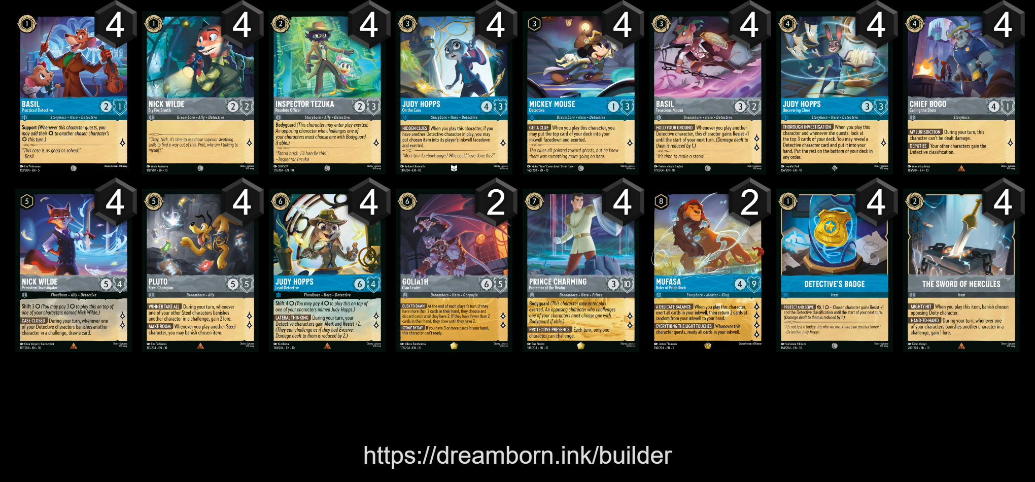 Also decided to cook up a Sapphire/Steel detective deck for Lorcana. I call this one Resisting Arrest (they're -almost- all cops with high resistance). For those characters who aren't already detectives, Detective's Badge and Chief Bogo will make them detectives. Dick Badge and Floodborn Judy will give all of your dicks resistance. Judy and Mickey help increase your ramp so that you can play Prince Charming and effectively bottleneck their ability to challenge. Between the added resistance and a few beefy bodyguards, you should feel confident in challenging and using Herc' Sword, Pluto, and Floodborn Nick to get rewarded. If your opponent is using a lot of card gain, cut it down with Goliath. If you haven't reached 20 yet, Mufasa should put you over.