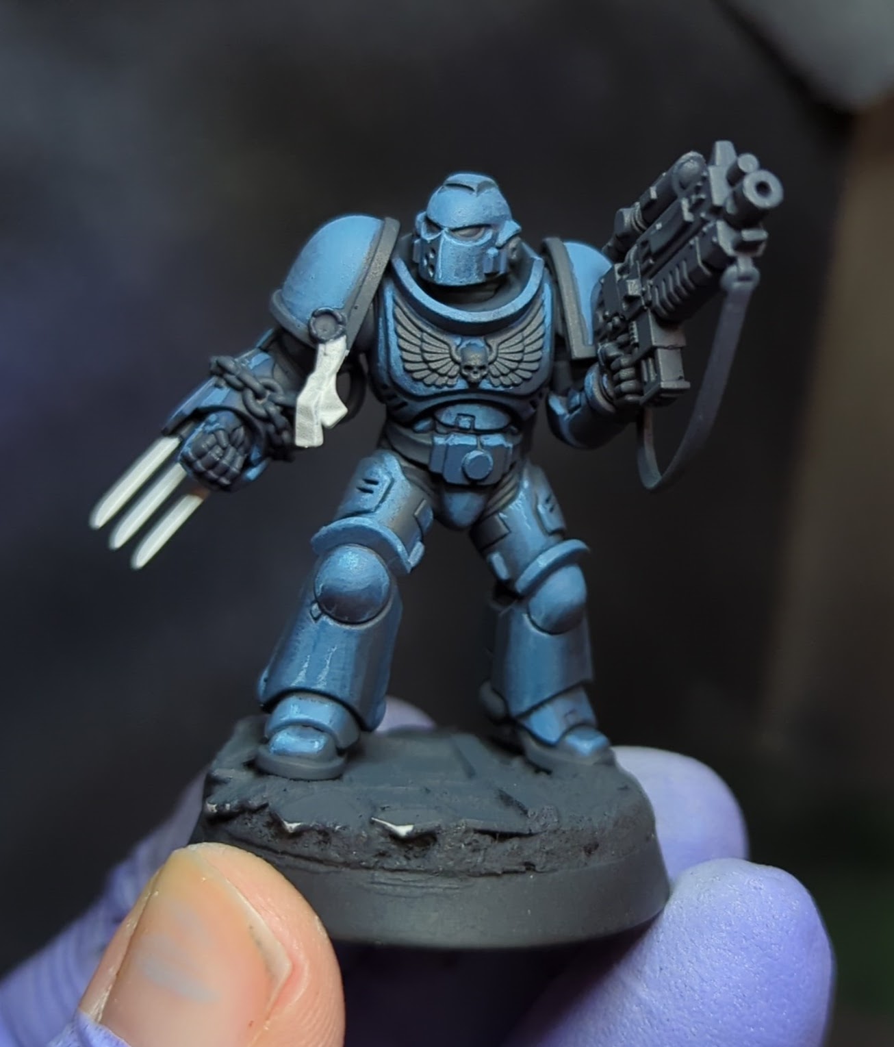 Trying to do my first volumetric marine.I had to stop here before finishing the initial blending pass because I paint with a battery powered light because I live in a third world hellhole, and it died. But I'm trying to really #trusttheprocess here, so I only had 2 colours on the palette anyway, so picking it back up to finish the armour should be pretty straightforward.>finish blending as best I can>add some more secondary highlights and edge highlights where it makes senseHe isn't supposed to be an ultramarine, this was supposed to be more on the grey side of things (no chapter in particular), I might see what options I have for the trim that might make it look a little less blue in contrast.