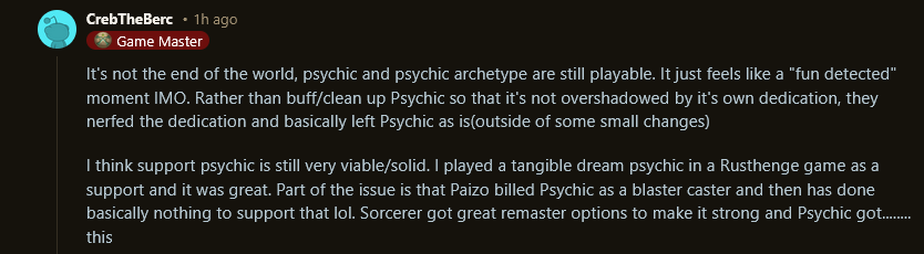 >>97402395It got leaked early, barely anything changed, some of what did get changed was a nerf, and psychic archetype got taken out back and shot (with a second bullet specifically for magus because amping can no longer combine with spellstrike in addition to the IW damage nerf)So no, psychic itself still sucks