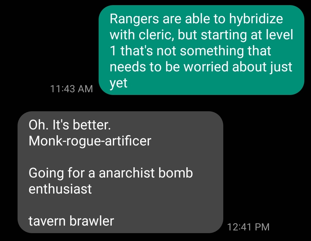 I like combat myself, but I wouldn't be opposed to a more narrative-based game. In that same vein, having a centaur that can shapeshift or shrink with magical bullshit is fine too. It's no less absurd to me than people trying to take fucking wheelchairs into a dungeon. Some things to consider