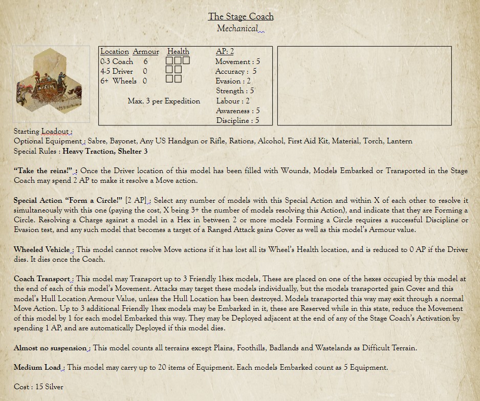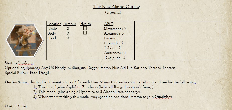 >>97275322>I really like the volumetric thing you have going with the edges.Ok, I'll try to keep those. > USAOk, gonna try to get it done for this evening, here's the New Alamo Outlaw. Very cheap, low Discipline, that will likely require you to use Ambush mechanics or loading up on Alcohol to get them to push through the mid and late game. Thinking there could be some campaign mechanics (maybe a Criminal sponsor?) where that roll may turn into a promotion mechanic. Any feedback on switching the Gunslinger to a Specialist profile?