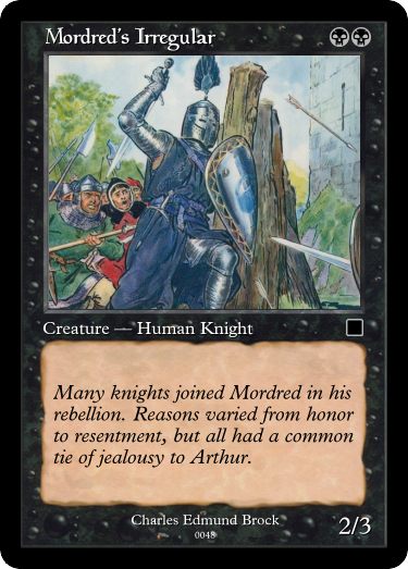I've spent the last year, studying, and designing a custom Arthurian set, originally intended to be based on Le Morte d'Arthur (like how P3k was based on Romance of the Three Kingdoms). However, as I continued to study, and look into different (and some obscure sources) this turned into a much more wider net. This set, which is no where near finished includes>Welsh Triads and The Magnibong>Pre-Vulgate Arthur traditions>Vulgate/Post Vulgate/Lancelot cycles>some English/Welsh fairy tales>and even a bit of the Victorian Arthurian revival (especially for art). I avoided the Italian and German romances entirely, and tried not to include weird outliners except when needed. Outside of art, nothing is sourced from the 20th century or onward. Also all art is public domain. I'm mainly posting here for feedback. Some will be art recommendations, flavor text (especially sourced) will be always welcomed.Comment too long. Click here to view the full text.