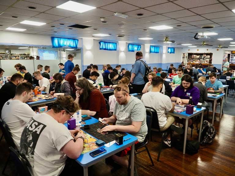 just an old working men's club, still has the stage, bar, lights, etc. little shop downstairs. this big room upstairs for all the tournament stuff, another function room downstairs for quieter board games and RPG stuff.it's a blessing compared to the glut of cramped "board game cafés" overtaking the UK. two quid in, plenty of space, nobody asks you to buy a latte every hour.