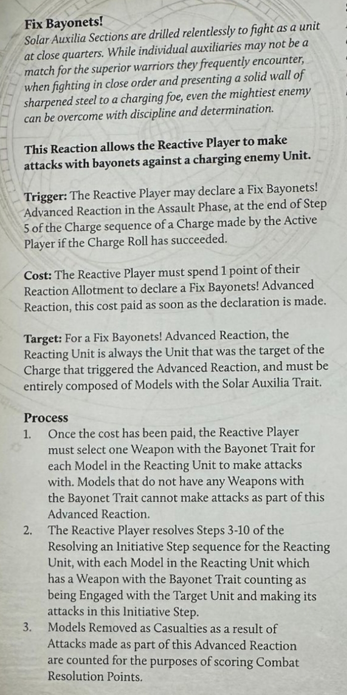 >>97282651Oh I'm a big fan of Pike and Shot myself. I would post that pic but I'd rather post the Bayonet reaction instead. This already exists, but I believe it could be two different things:1. First of all, it should be available to any unit wielding bayonets, not only Solar Auxilia2. Second, bayonets are auxiliary weapons but aren't necessarily defensive only. You can affix bayonets and charge instead of simply prepare for the enemy to reach you. That's why I'm calling for bayonets to give you a bonus bigger than AP5. A soldier with a bayonet does not need to switch from his rifle to his combat blade – let it grant Assault to the gun it's mounted on. Bayonets already were +1S before, maybe let that be the extra bonus for the more expensive chain bayonets, on top of granting the Assault keyword?3. I greatly disagreed with spears being both faster and stronger than swords past edition. S(U) +1i works in both offence and defense. I'd rather swap their Precision for Breaching 6 to make them be more in line with the others...but I'm sure you divergent folk enjoy the difference (and never use them anyways).>>97282640I'd unlock bayonets on weapons, not units, because I want Seekers to be able to get bayonets on their kraken bolters but not on their sniper rifles.If you unlock bayonets on bolters, kraken bolters, plasma guns and melta guns (??), that affects Veteran Tacticals, Tacticals, Tactical Support squad, Seekers and Centurion Command Squads and Augury Command Squads.
