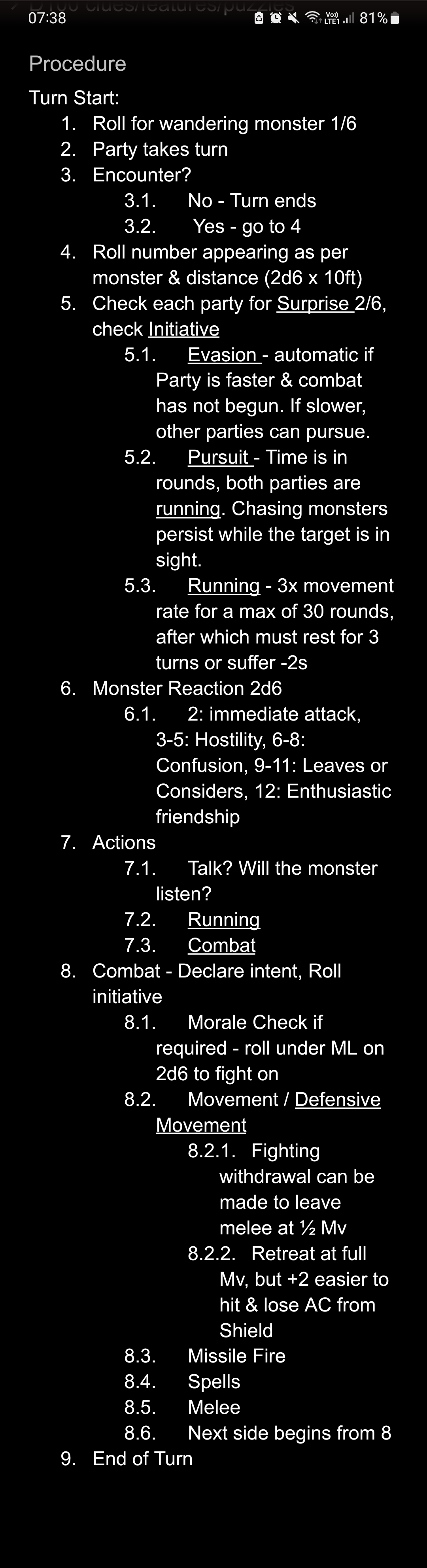 >>97266862I've looked. There really isn't anything that shows you the process from behind the screen. Bandit's Keep on YouTube is probably your best shot.However I would advise just writing out in your own way a flowchart or procedure notes after reading the Moldvay Basic rules. Strictly following the procedure should be all you need as an experienced DM to find yourself playing in the OSR style. My own procedure notes in picrel may be of use, at least as an illustrative tool of what I'm talking about. Start the game as close to dungeon crawling as possible when you begin play.