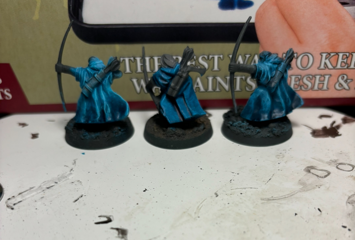 >>97275088Basecoat, wash. drybrush, and then the "highlights" I described. Those cloaks are very good as well and those colors are really nice. Once the quivers are painted it's gonna really stand out.