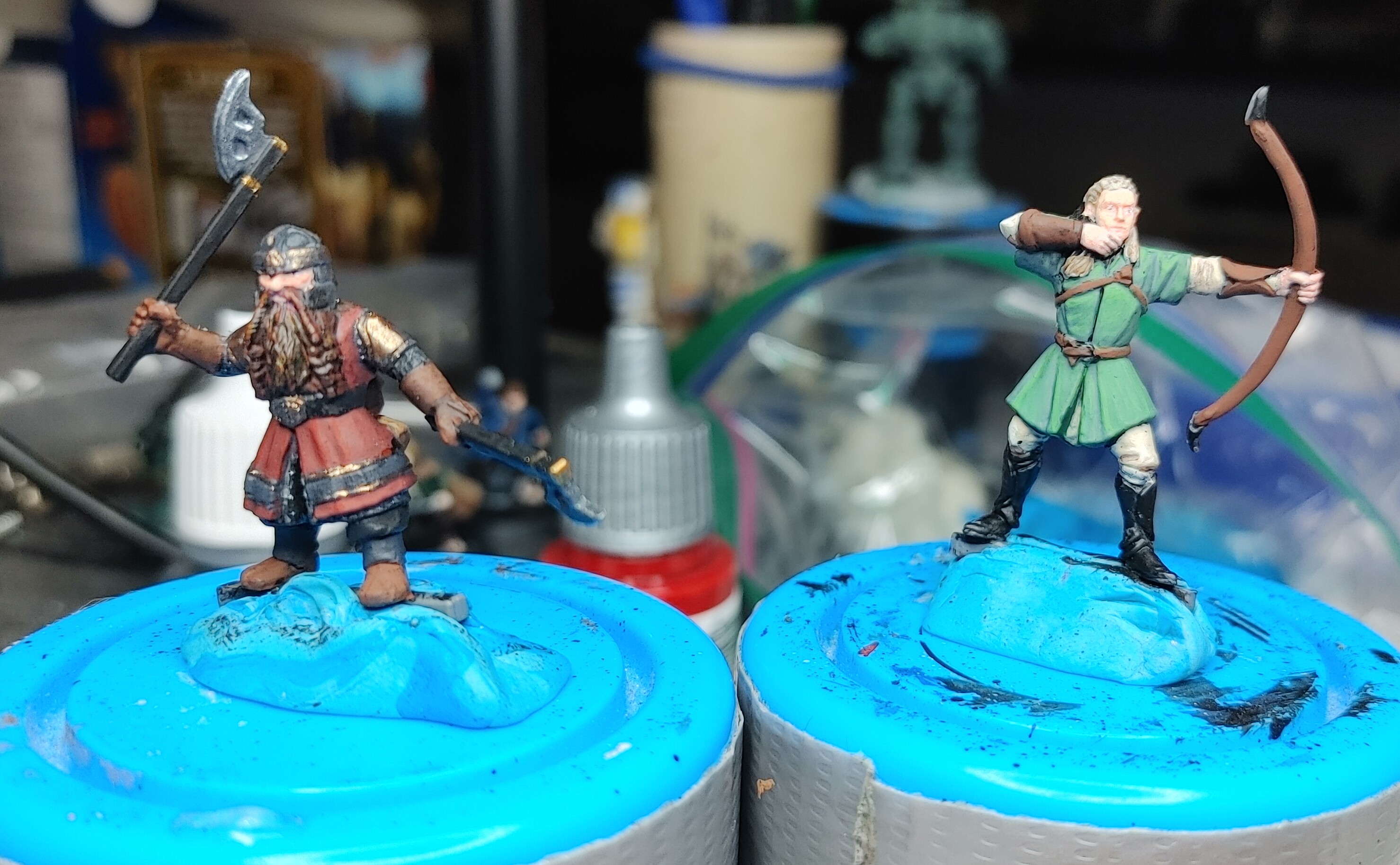Progress! I'm a little stuck now on what to do with Legolas' boots/bracers though. Also not sure if I want to keep the stripe around Gimli's lower half dark grey, or if I want to push it black like his belt.>>97366070Just a trick of the light/angle mostly