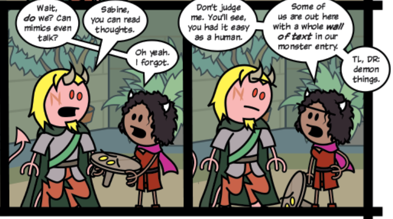 >>97347329https://www.giantitp.com/comics/oots1331.htmlDoes this count?Otherwise:https://www.giantitp.com/comics/oots1307.htmlWhere they talk about the differences between baleful polymorph and the normal polymorph spell.The battle with Calder hasn't been that long ago, only a year.
