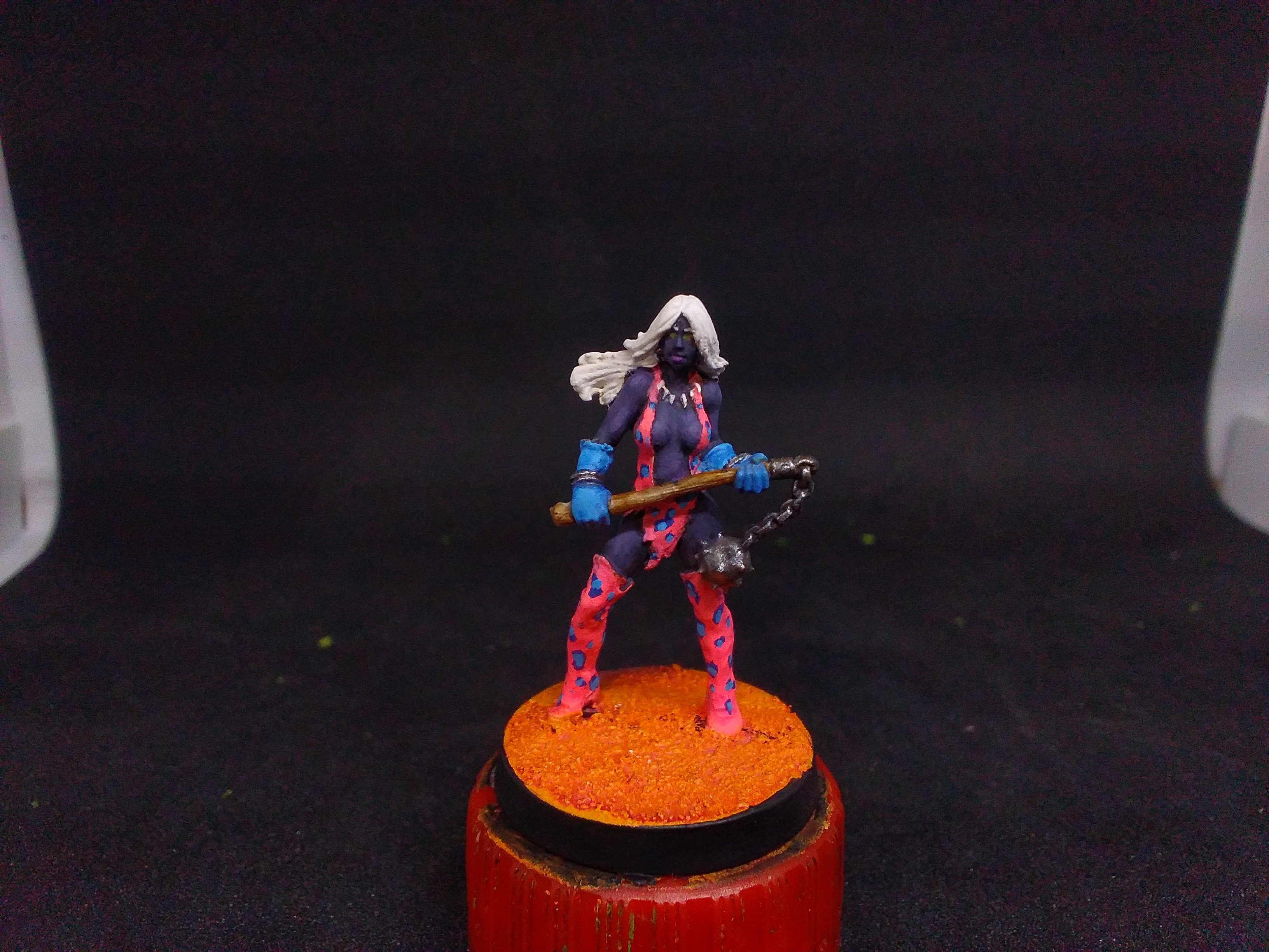 Here's the finished drow lady!Think the skin came out alright, first time doing drow purple/blackAlthough I like the pink leopard, it def didn't work with pale skin and orange desert