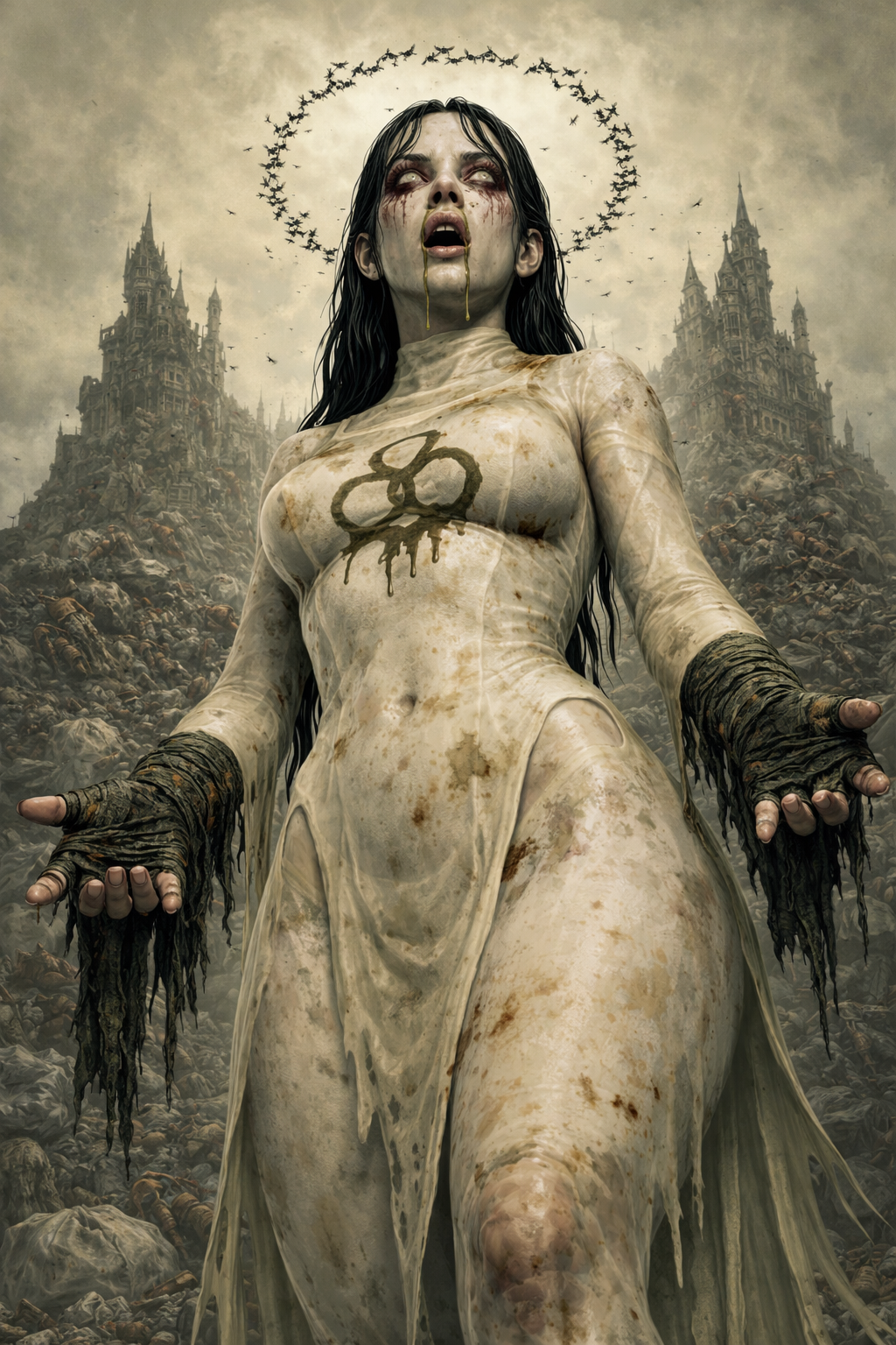 A halo of flies orbited her skull, like a constant droning crown. She raised one swollen hand and beckoned you forward.Your stomach lurched. The air was thick with it; the vast, massive sweet-rank altars of rot looming behind her, cathedrals of corruption that pressed into the lungs and clawed at the eyes. Your nose burned, then ran freely, tears following in helpless sympathy.From her own nostrils, viscous strands of snot slid downward. They did not splatter. They did not smear. Instead, they fell with deliberate grace, congealing upon her breast into three perfect rings, interlocked and whole.She writhed in rapt, fetid ecstasy, and she smiled at you, slow and knowing. She could see the response she had drawn from you by glancing at the tinting of your pants. She leaned closer, breath hot and sour, and pressed her blackened tongue to your lips.You did not pull away.You took it into your mouth and tasted her. Pain flared at once; her saliva burned, raising blisters along the soft skin inside your cheeks, but you swallowed the sensation down, welcomed it, let it mark you.