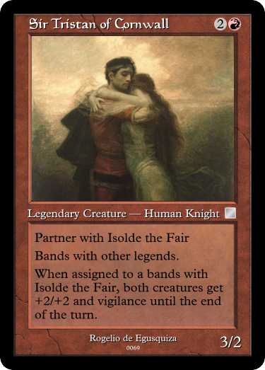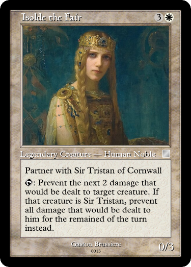 With Tristan here, we go into Tristan and Isolde, one of the more famous splinter tales (which was originally a story completely independent from Arthurian legend.Before you say this is a commander mechanic "Partner with X) was originally a 60 card mechanic, and was mostly features on non-legendary creatures.