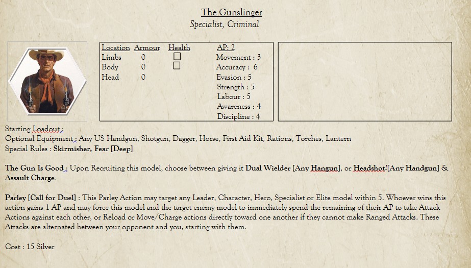 >>97279360>Gunslinger as SpecialistI'd be alright with that, but could we have a ranger trait that lets you take them as Elite? That way you could still have a posse