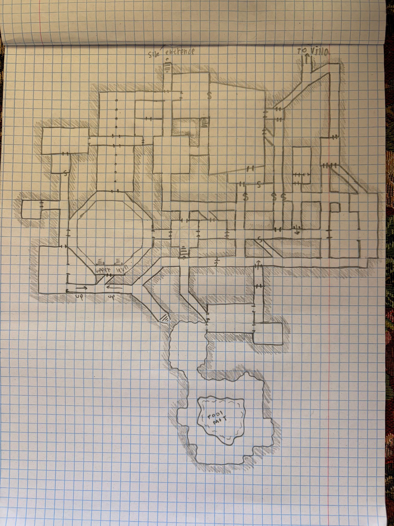 right, started fiddling around with appendix A today and came up with a first floor. also went by the method suggested here to get some ideas>https://youtu.be/lk_5gNe0oSsthe main ideas I came up with are - old not!roman fort & villa, villa now populated by crazy guy that believes he's the local administrator & his seemingly tamed basilisk. he will demand taxes if the party talks to him and will be friendly if they comply. he has a statue garden in his yard and is secretly allied with the goblins on floor 1, his villa has a passage to their area of the dungeon.the main dungeon is in the keep, it's walls melted by dragon fire long ago and fused them to make a giant bowl like structure that is now mostly flooded. ruins of main keep lead to first level, home to goblins and tomes of previous inhabitants (now undead) second floor will house hobgoblin area, they got access to the still standing tower and an old MU fused with mushrooms on the top floor. also maybe some frog man in flooded caves?3rd floor will have a dragon cult trying to awake a petrified dragon egg, a few apprentices sent by the wizard in the local tower to investigate this place (now hiding in on of the rooms after suffering grave loses) and a golem guarding a vault