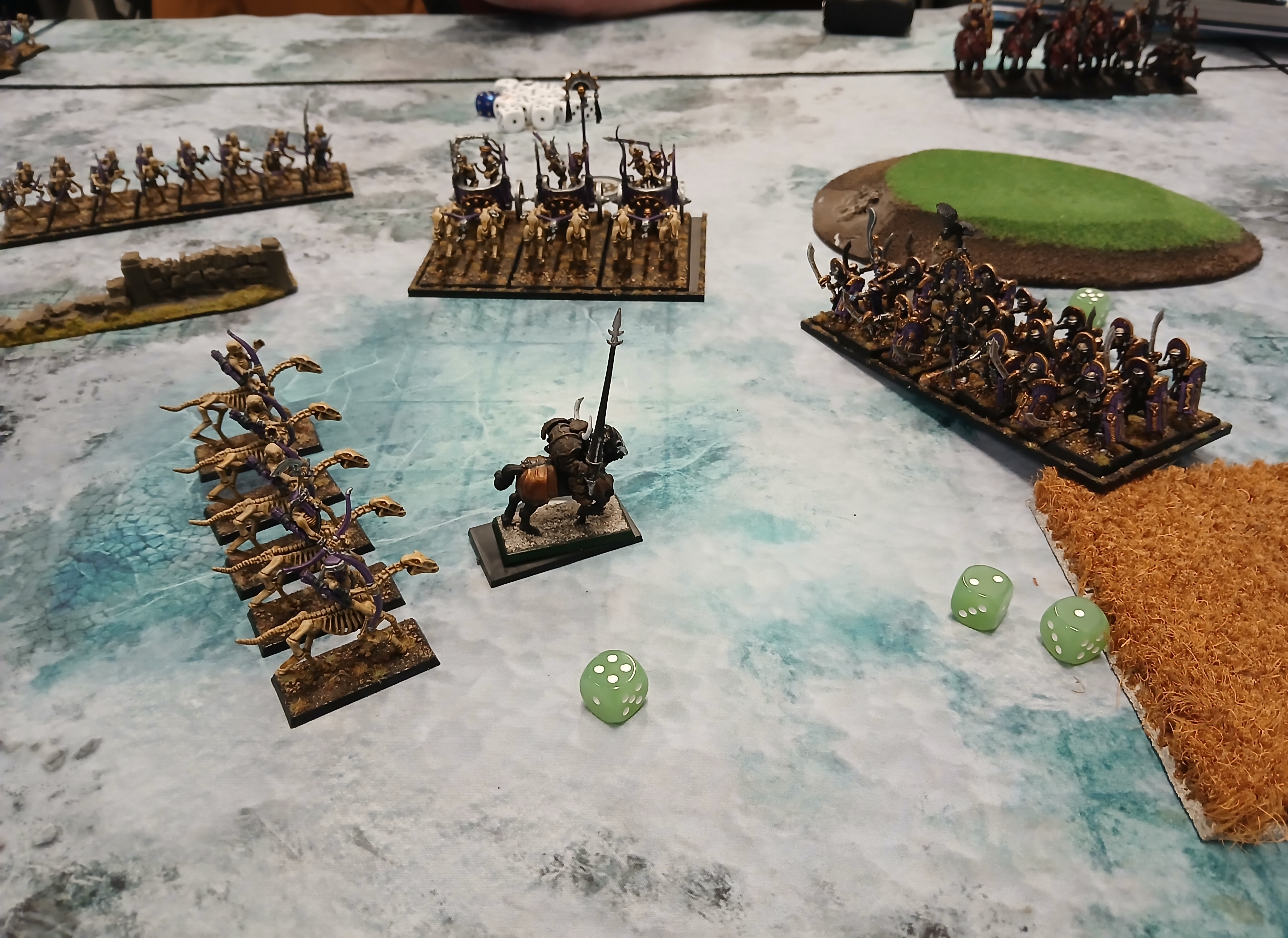>>97396439Better and more clear picture. Only thing missing is skeleton foot archers x 5 but much closer to see. A block of 20/21 elite skeletons with Str4/T4 and 6 wounds ignores saves.5 archers3 chariots5 horse archers20 skeleton archersWizard on foot lvl 2 and ruby ring.