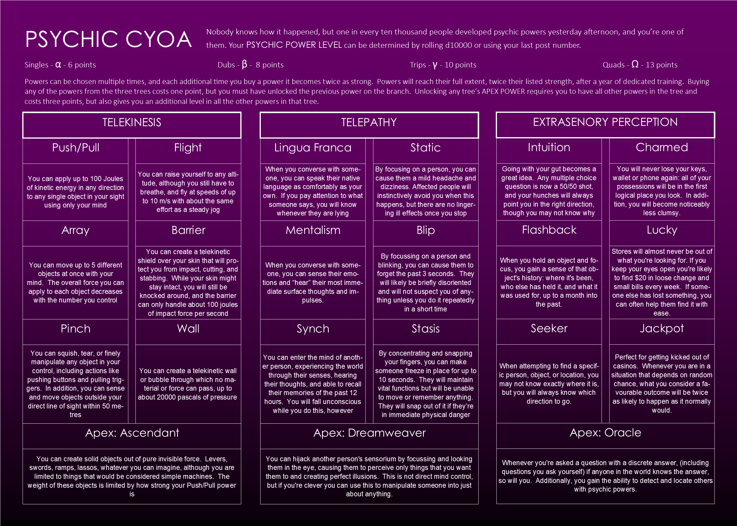 >>97211378>>97211387Mind controlling the population into viewing the wizards as terrorists would be effortless. All it takes is for 10 wizards around the world to throw fireballs and blow up city blocks and burn down buildings. The public will be far more likely to accept psychics as a government program or natural evolution of humanity. They can be gaslit into viewing psychics as more favorable than wizards who will be shown burning down cities or causing mass collateral damage. Psychics can manipulate this information on a mass scale easily.Psychics aren't going to fight in a direct all-out war. They're going to brainwash the media giants, take over the governments, and use normies and propaganda to demonize all wizards. They can mind control each other to set checks to prevent betrayal, which is a MAJOR weakness of wizards in this war. Psychics can brainwash their own team so that if captured they commit suicide or give false info, or the memories just straight up get deleted. These psychics can, at the same time, brainwash wizards and turn them against their own team or commit terrorist acts to easily manipulate public perception.Precognition is also more practical than divination. The psychics can mind control each other to block out commune interference. Commune wizards can troll and irritate the psychics, but a brainwashing psychic can rewrite the mind to laugh it off, turn it into pleasant sounds, or use other mental tricks like thought exercises to negate it. Same for bad dreams. Brainwash the nightmares away. Next, wizards have future divination, which is powerful, but you still have to actually change events in order to try and prevent them. Probability manipulation equalizes it. At the end of the day I think divination wizards will despair that the other wizards are retarded glass cannons with no plan (no intelligence increases unlike precognition), while psychics get organized and weaponize governments and agencies.It's a wash. Psychic wins.