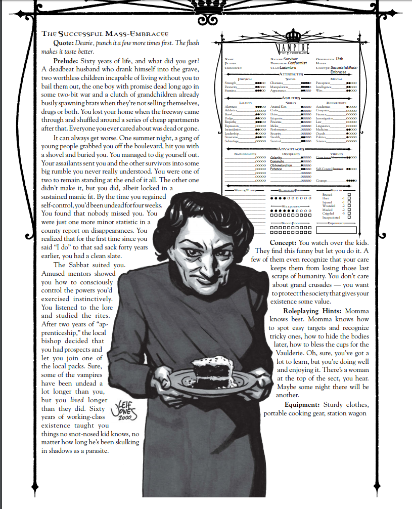 >>97229639Sabbat Granny is top tier. A friend of mine used the only intelligent gangbanger turned Ventrue Antitribu axeman as a character. Down to lowkey hating his sire and trying to find a way out of his predicament, get ahead, and get back to running things. I always wanted to use Vampire Dad from the Thinblood book as a character/plot hook in a game.