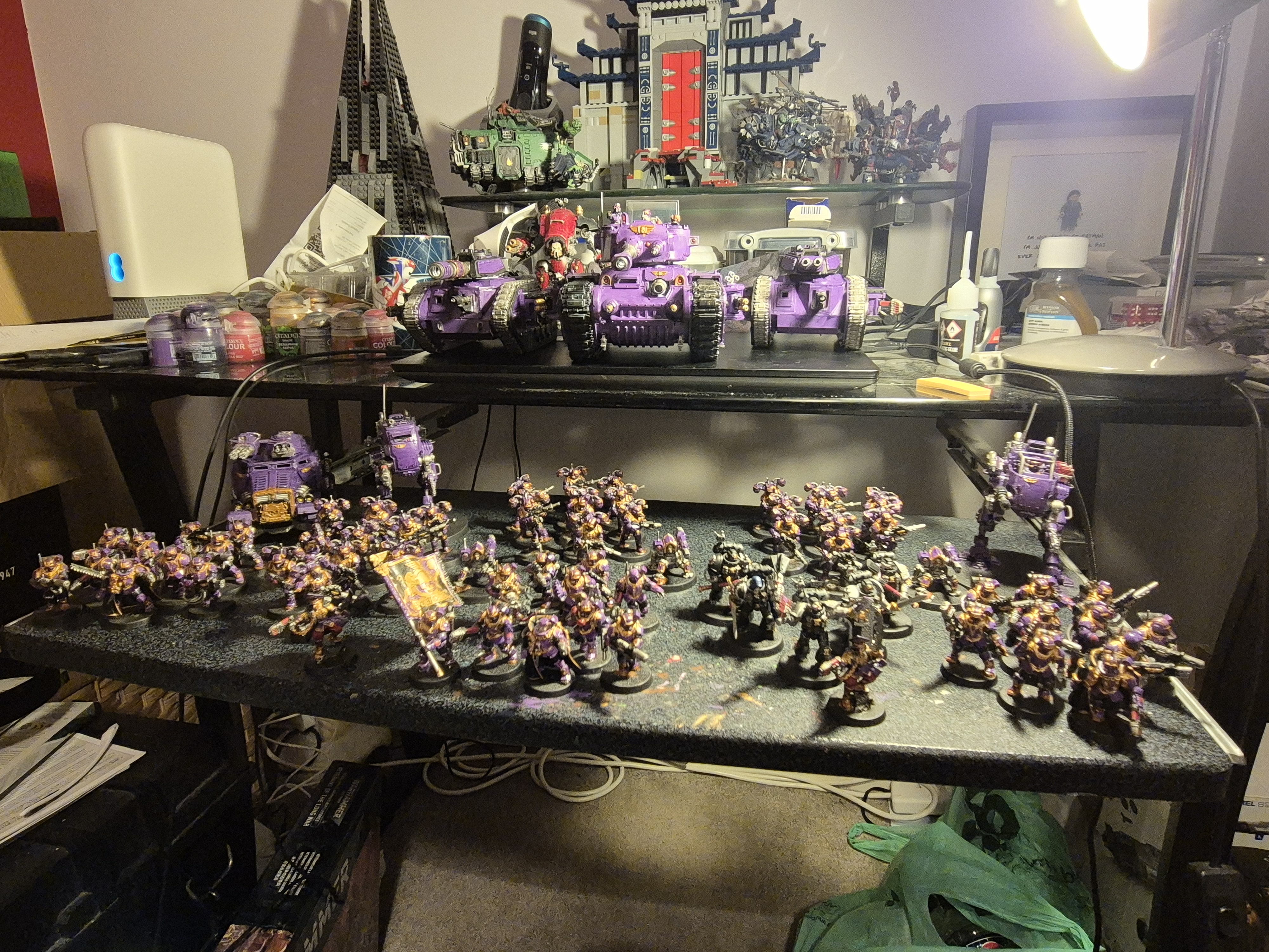 >>96795865Ive got a bunch of stuff but most fleshed out is my Tempestus Scions>Name47th Violet Canines>ColoursBlack fatigues, brown boots, purple carapace and berets, gold trim, red plasma and black gun cases >Key UnitsScions, Aquillons, Scion command squads>SummaryThe 47th Violet Canines hail from a system called the Brontë worlds, recruiting from the four major worlds. These men thrive in the thrill of the fight, dropping in with precise infantry strikes followed up with an armoured strike from their armour division. In times of extensive campaigns the Canines call upon auxiliaries from a world in the Brontë system called the Blackwoods, a jungle world home to the Ivory Devils, a regiment of Ogyrns and Jungle fighters.Thats about it mostly, for their inspiration they take heavy inspiration from the novels Wuthering Heights and Heart of Darkness (thats mainly filled by the Ivory Devils), they also have their squads named after british folklore hounds (such as Squad Barghest for example), the attached picture is the army I took to a GTMy favourite unit in the army so far is probably the Rogal Dorn affectionately named Nelly (the maid from Wuthering Heights who recounts her experience in the novel), with her Tank Commander being called Hindley (another character from Wuthering Heights).