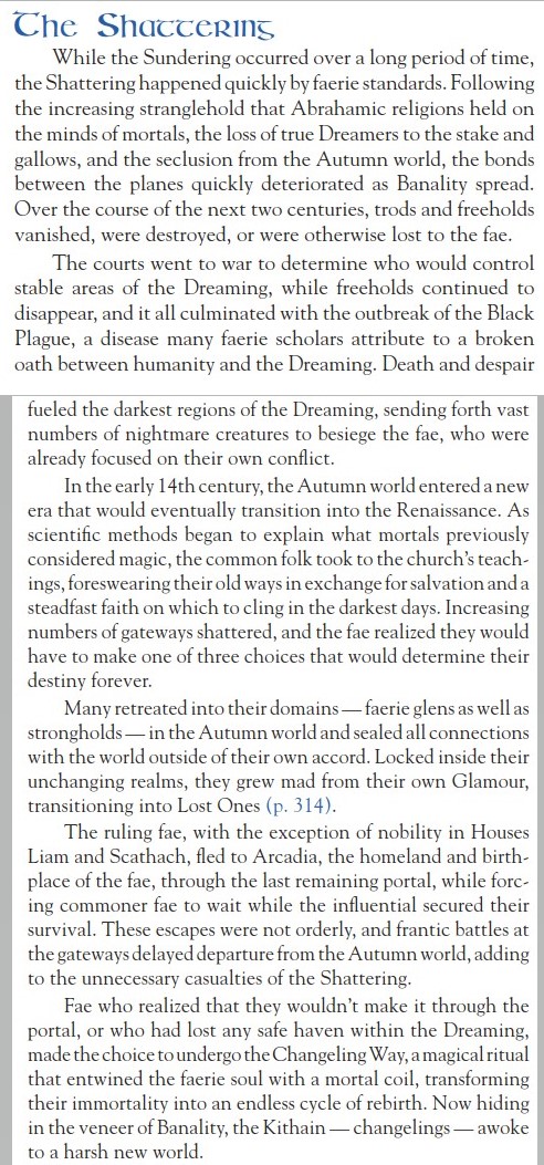 >>96830479>What was preventing them from returning to Arcadia when nobles did not have that difficulty.The Arcadians only got back to Arcadia in a panicked fight-or-flight evacuation to the last portal still open that was actively crumbling - unless you were House Eiluned and saw this coming early. They only came back after a world-shattering event (the moon landing), and their muddy memories imply it was more being exiled by their buddies back home for whatever reason for most of them.Also, no matter how any Changeling tries to scrub off Banality, being on Earth post-Shattering in a human body means you have what's called a "Banal Shiver" in your soul, and any methods to remove it would most likely involve losing your mind to Bedlam from overexposure. That wedge causes Arcadia itself to actively reject attempts to find it, and supposedly there are armies of those true fae who made it home on guard in the Deep Dreaming, prepared to kill their own to protect the last Banality-free place in existence.