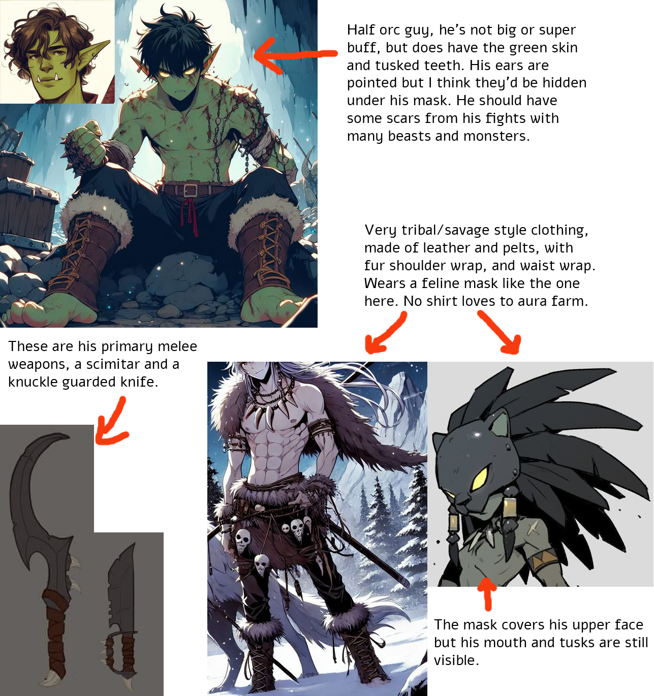 Hi, I'm going to be playing my first game of D&D, and a friend told me I could get some art for my character here. So I hope I'm doing this right.My character is a Half-Orc rogue called Grimgar the Prowling Fury.His mother was an Orc shamaness, and his father was a human slave. He has his father's lean build but his mother's green-tinged skin and raw strength. His tribe shunned him as "diluted blood," too human to be a true warrior, but his mother still tried to train him in the shamanic arts of beast-speaking and herbal poisons. But Grimgar's true affinity lay in the shadows—stalking prey like a ghost, striking from ambush with crude bone knives.Not going to get into too much more about his backstory here, just that there was a coup by a rival Warchief, Grimgar's mother was killed, and Grimgar was blamed. Killing his pursuers, he was now branded a kin-slayer, but he seeks the skills necessary to get revenge for the murder of his mother.Description: He is lean and green-skinned, with slight tusks (they may get longer as he ages, but they are underdeveloped compared to other full-blooded orcs his same age).We wears mostly leather hides and furs, as well as handmade jewelry made up of trophies from his kills. As well as a crafted feline mask that covers his upper face, made by his mother to help him appear more intimidating and hide much of his human features.