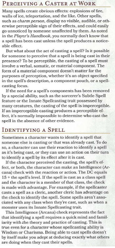 >>96766499So, within the universe, people rarely know what is being cast. To truly figure out what's being cast, you need to recall knowledge as the spell is being cast in the moment. When someone casts a Spell, they don't say>Warlock: "ELDRTICH BLAST!!"They most likely say>Warlock: "Tdll'hc Ebi'ctab-rs!"Which means nothing to 99% of people, then the spell itself happens. And the spell itself can then look completely different for each spell caster, one could be a magical blast of flame like force another could look like ribbons, while another could like swords and axes. This gets worse when you factor in that not everyone casts 'spells'. Some creatures can make attacks that could look similar to certain spells. All's to say, magic is so personalized that it borders on impossible to know exactly where the origin point of the magic comes from without explicitly knowing the vast types of spellcasters in the world. And even then, you could still make a mistake just because the effect you're examining looks similar to something else. >wouldn't any knowledgeable mage be able to see an Eldritch Blast being cast and instantly be able to tell that "hey, that person must've made a pact with some kind of being" or something like that?In 5e D&D the best case you could get for this- would be having a really high Arcana skill stat, taking a Reaction to identify the spell being cast in the moment (Note it must have components that you can see), then you can determine what it is on a success, from there if your character is aware that the Eldrtich Blast spell could only be obtained from a Pact. Then yes, but if they don't know that then they won't!