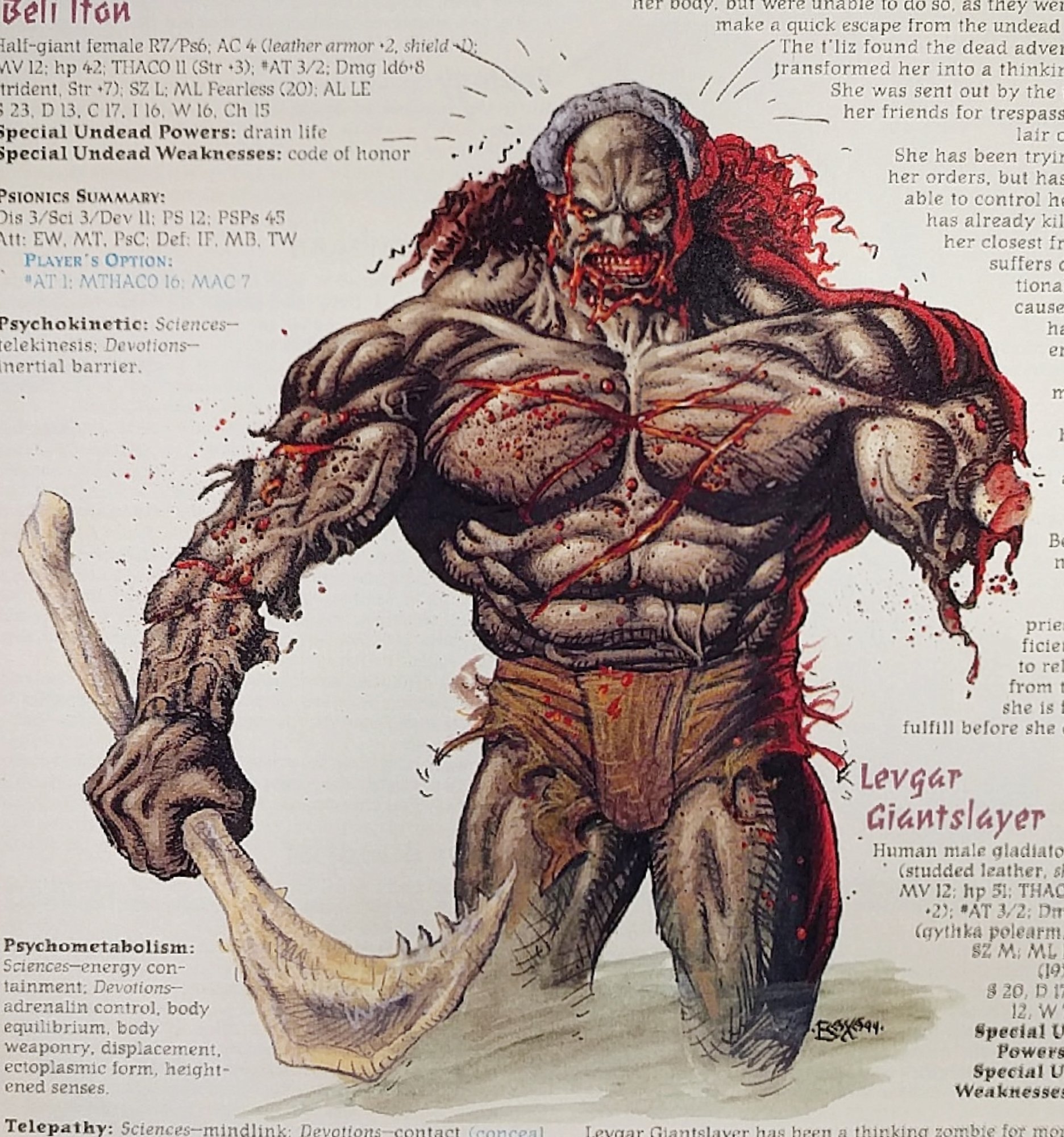 Thinking Zombie from the Dark Sun monsters book in the 90's. Best image I could find but I remember the sample one was this half-giant raised from the dead and sent out to hunt down her former adventuring companions. >>96758888Fiend Folio.