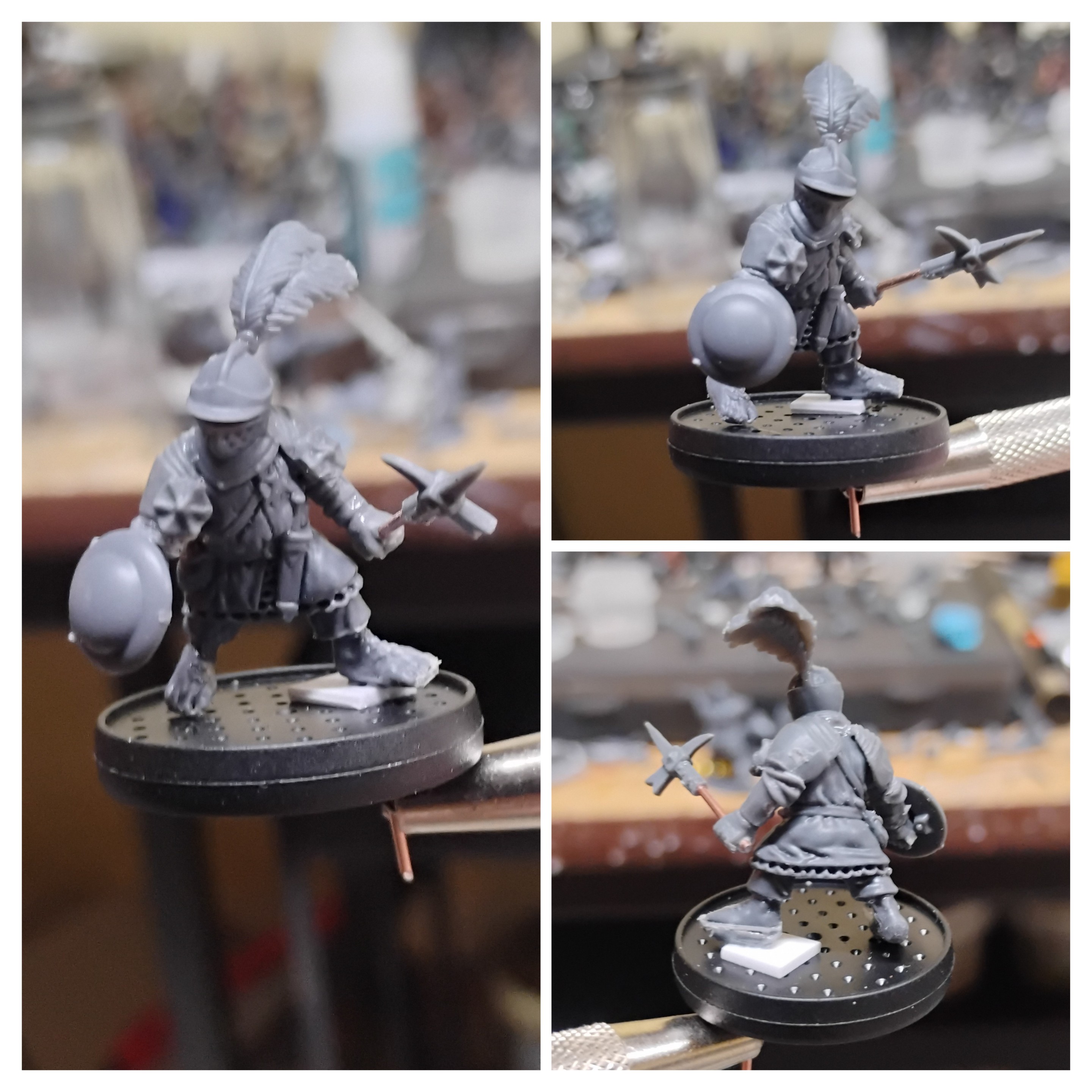 Got some more plastic in over the weekend. This is probably the most extensive conversion/kitbash I've done yet. The weapon arm and warhammer alone is five different pinned components sawed up, filed and scribed down and fitted together. Once again I used the tilt pinning method that I have used for my other halfling conversion to give him a more dynamic/at the ready appearance and break away from the more conventional ranked up, defensive posing you see with this halfling kit.The key part to having a dynamic appearance, and to avoid that stilted look you often see with multi part kits, a lot of it has to do with torso orientation. Having worked with metal figures and observed the techniques various traditional sculptors use has probably done me a lot of favors in this regard. The WGA halfling kit is great for kitbash/conversions because of a few different factors. One being that there are a lot of parts from a lot of kits from a lot of different manufacturers that scale up well with it. The pauldrons and warhammer head on this guy game from a Perry miniatures kit. The second is that the shorter limbs make it easier to put up a dynamic pose without having to chop up the legs and do any sculpting at all. Though you could do this, and probably achieve an even more natural appearance.This guy is another heavy infantry concept, has more of a renaissance feel to him than the others so far. Still have a couple touches to add. Namely he needs a scabbard and maybe some more feathers in his plume.When something is missing with a medieval Renaissance sort of motif more feathers in the plume always seems to be the answer. You can also take advantage of that by tilting the plume to give the appearance of motion alongside the tilted torso etc if you are going for an aggressive attacking pose, or the opposite if you wanted a more static pose.