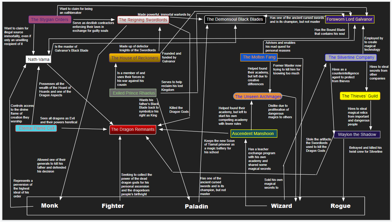 >>97820528>The Silverline Company Board of TrusteesA cartel of indigenous dwarven artificers hidden in the mountains and financed by the riches of ancient elves to research new weapons of war and technologies and profit off of the in-fighting of the warlords. >The Dreamweaver Shai-TannAnd ancient and powerful djinn that haunts the far reaches of the realm, only appearing at times when souls are most desperate to offer them a terrible twisted wish to fulfil their hearts desires.>It That Waits Beyond the FlameThe shadowy psychopomp that ushers the souls of the dead to the great beyond through a burning conflagration, only known by those who have travelled beyond death's door and returned, who sometimes marks a soul for his collection and decides to keep them for unknown reasons.>The Queen of the Cthonic ImperiumA young and brash queen who rules over a continent spanning empire from beyond the silver seas (from which the warlords once hailed) and has dreams of immortality and has sent her agents to ingratiate themselves and keep tabs on these legendary blades.>The Council of Thirteen Daemons BoundThe true rulers of the Cthonic Imperium are the thirteen warlocks who each represent one of the major archfiends in a supposed partnership with their human agents though six of the thirteen have broken contracts and become possessed and no one knowns what will happen when the daemons have majority rule.(2/2)