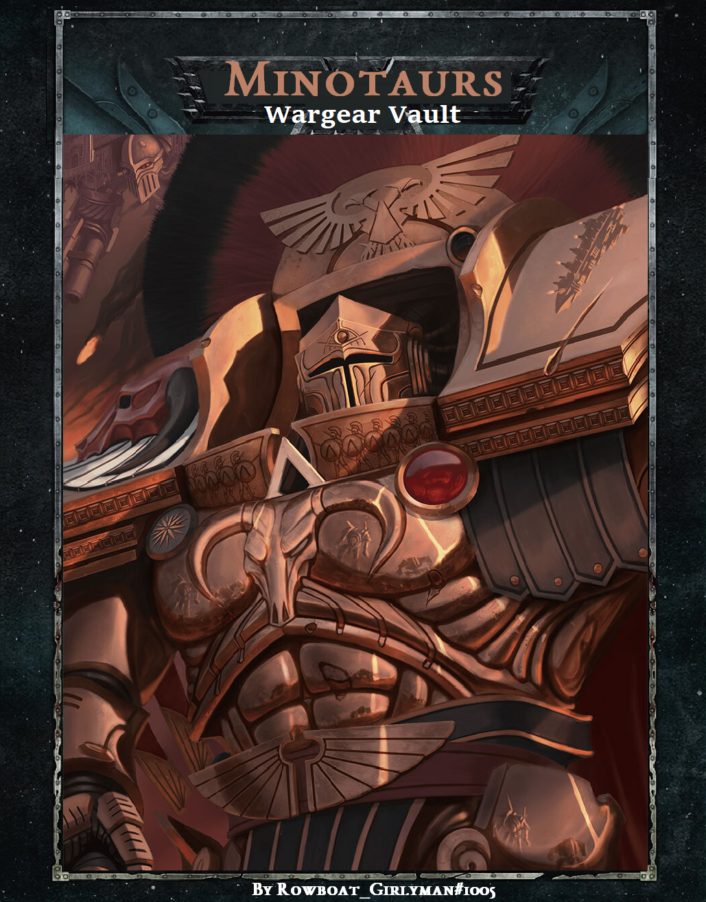 Right fucknuts, another homebrew expansion for you to sperg over, this time it's the Minotaurs. Got some good weapons, upgrades, Arkonak Terminator armour, some wierd centurion pattern and the skylance gunship because You will never stop me making vehicles, enjoyhttps://ferrus-manus (dot) itch (dot) io/wargear-vault-minotaursCover art by Kanonbal2
