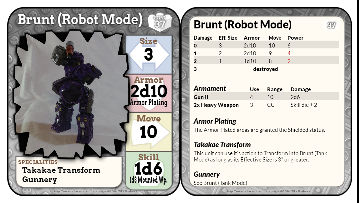 >>97831474>https://brikwars.com/rules/2010/cover.htmFixed that for you.Have a stat card generator as well:https://westnordost.de/statcard/>>97831524>in fact they're not even in the art anymore because they sent the creator a cease and desist apparently they trademarked the shape or some shitIt was an Image infringement thing, Mike's trademark style ironically is now property of the Lego Group, hence he had to Mega Blok/Roblox it up as seen here: >>97821241(This only became an issue when Mike published a hardcover version for sale, because again, his original style is Lego Property.)Of the Cloaans, only Mega and Best-Lock will actually have minifig accessories, and one of the reasons I prefer 2010 is that Construction Points allow you to stat up things that are NOT Minifigures.