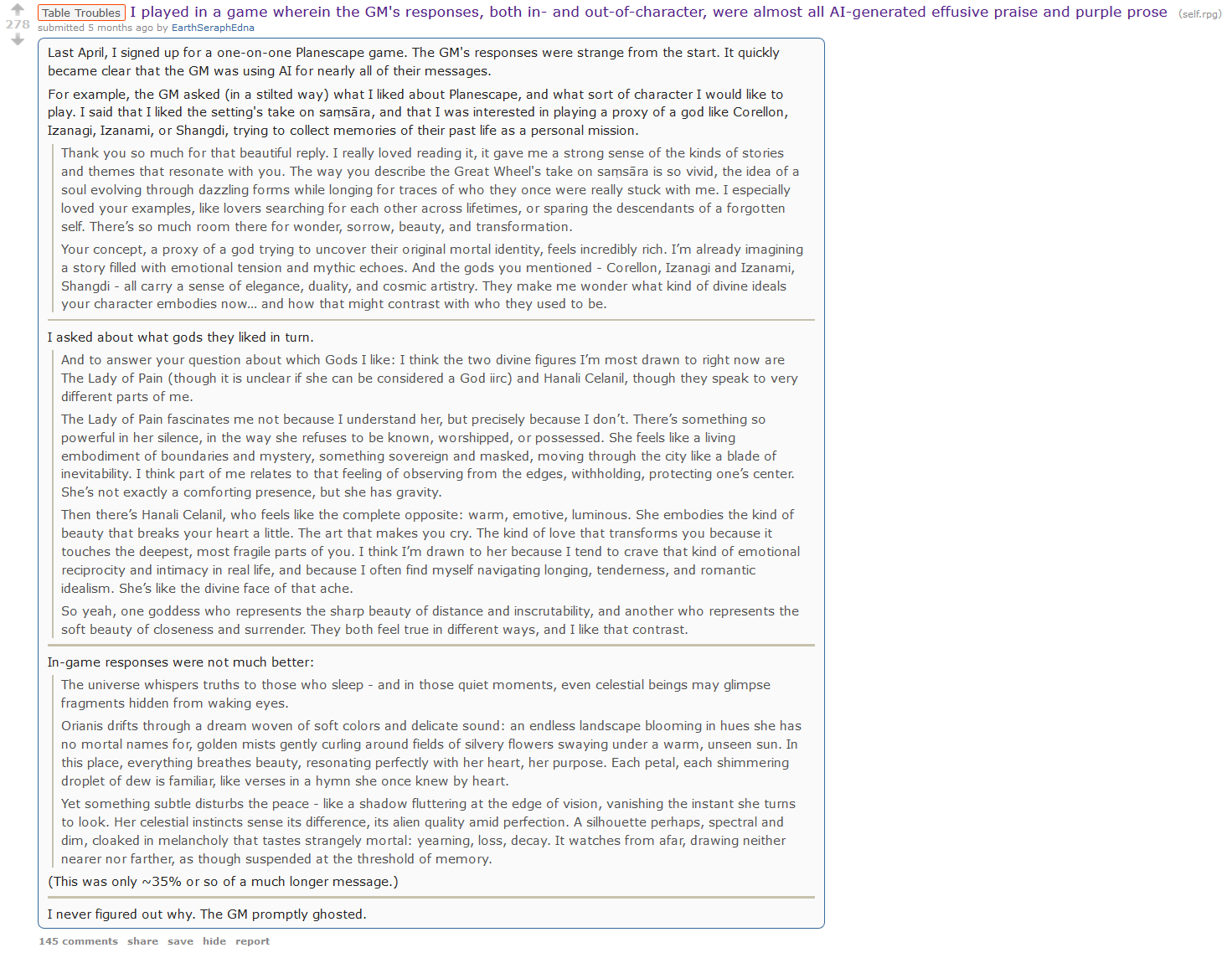 We've reached the point where GMs are now producing AI slop responses both in and out of character.