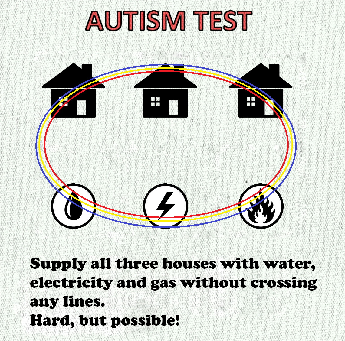 unlike the real world, where you can have one set of pipes go through multiple houses, this puzzle is set in Maths World, where actual engineering solutions are ignored, and both the houses and the utilities function as nodes on a graph, and the goal being to have 9 edges (three each from each utility, to each house) without intersecting any lines